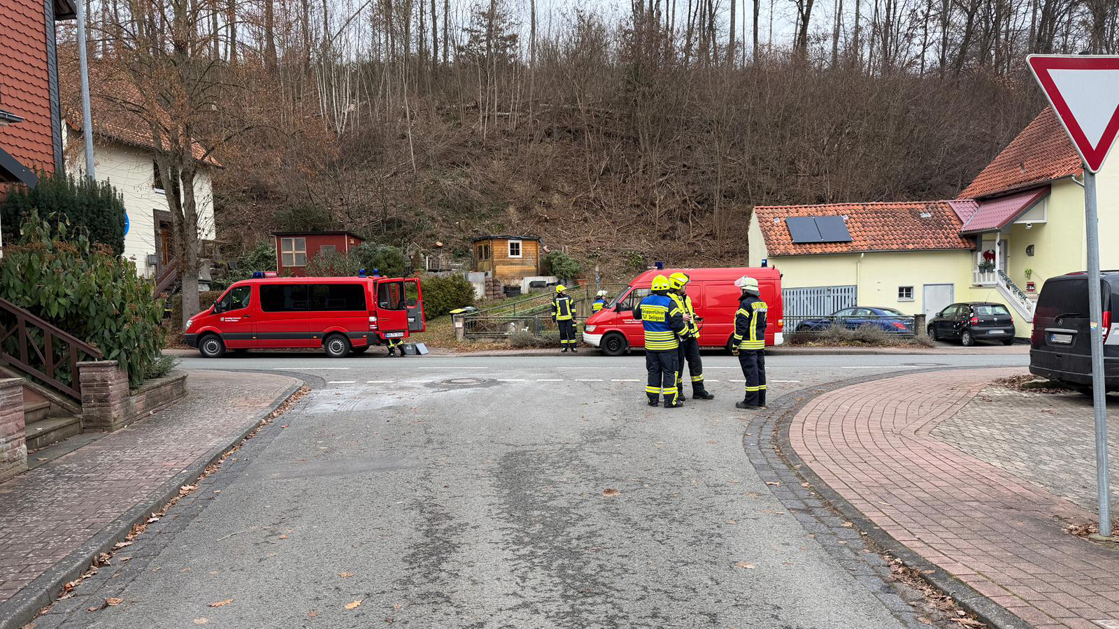 Rund 20 Einsatzkräfte rückten mit drei Fahrzeugen an. Zusätzlich traf der Brandmeister vom Dienst der SCHOTT AG Grünenplan ein, der ein spezielles Messgerät zur Überprüfung der Luftqualität mitführte.