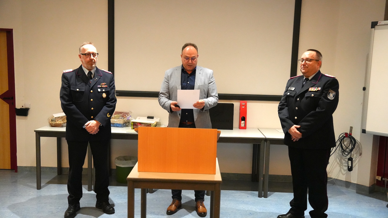 Zu Beginn richtete Landrat Michael Schünemann das Wort an die Anwesenden. Er dankte Jens Heinemeyer für dessen langjährigen Einsatz und begrüßte Michael Eisenbeis in seinem neuen Amt. Dabei hob der Landrat die besondere Verantwortung hervor, die mit dem Engagement in der Feuerwehr verbunden ist. Menschen, die sich jederzeit für das Leben anderer einsetzen, seien ein tragender Pfeiler der Gemeinschaft. Mit Blick auf Heinemeyer betonte Schünemann, dass dieser über viele Jahre hinweg Verantwortung übernommen und seine Kameradinnen und Kameraden sicher durch zahlreiche Krisensituationen geführt habe.