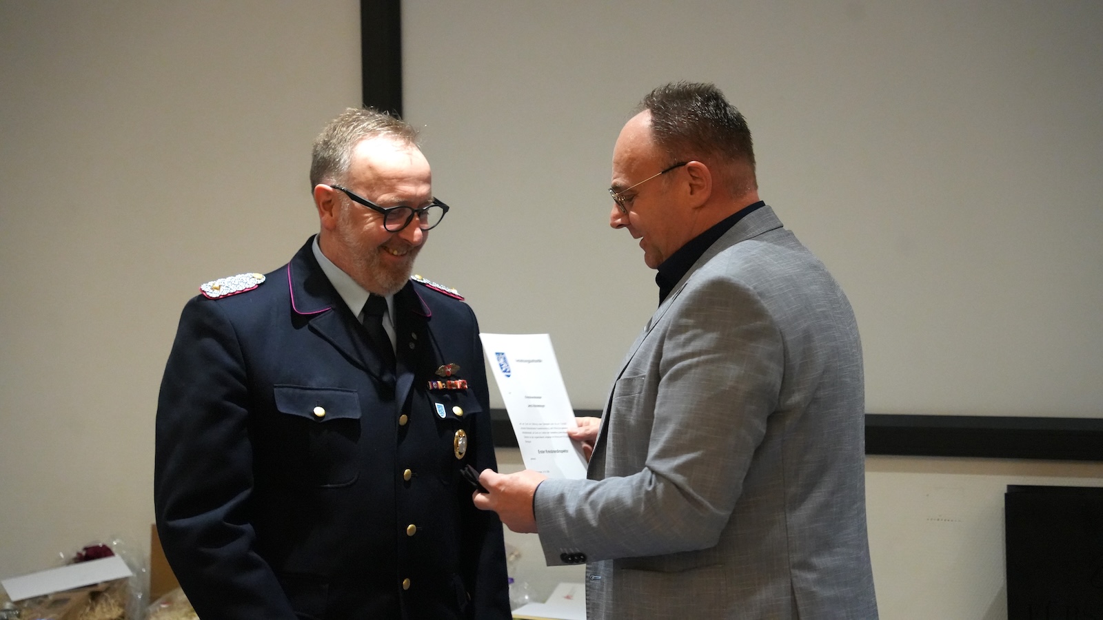Michael Eisenbeis dankte seinem Vorgänger für dessen Arbeit und zeigte sich erfreut über die neue Aufgabe. Er kündigte an, begonnene Projekte weiterzuführen und einen besonderen Schwerpunkt auf die Zusammenarbeit mit der Verwaltung zu legen. Als eine seiner ersten Amtshandlungen übergab Eisenbeis die Leitung der Kreisbereitschaft an Adrian Teiwes und beförderte ihn zum Ersten Hauptbrandinspektor. Zudem zeichnete er Ralf Knocke für besondere Verdienste im Kreisfeuerwehrverband aus.