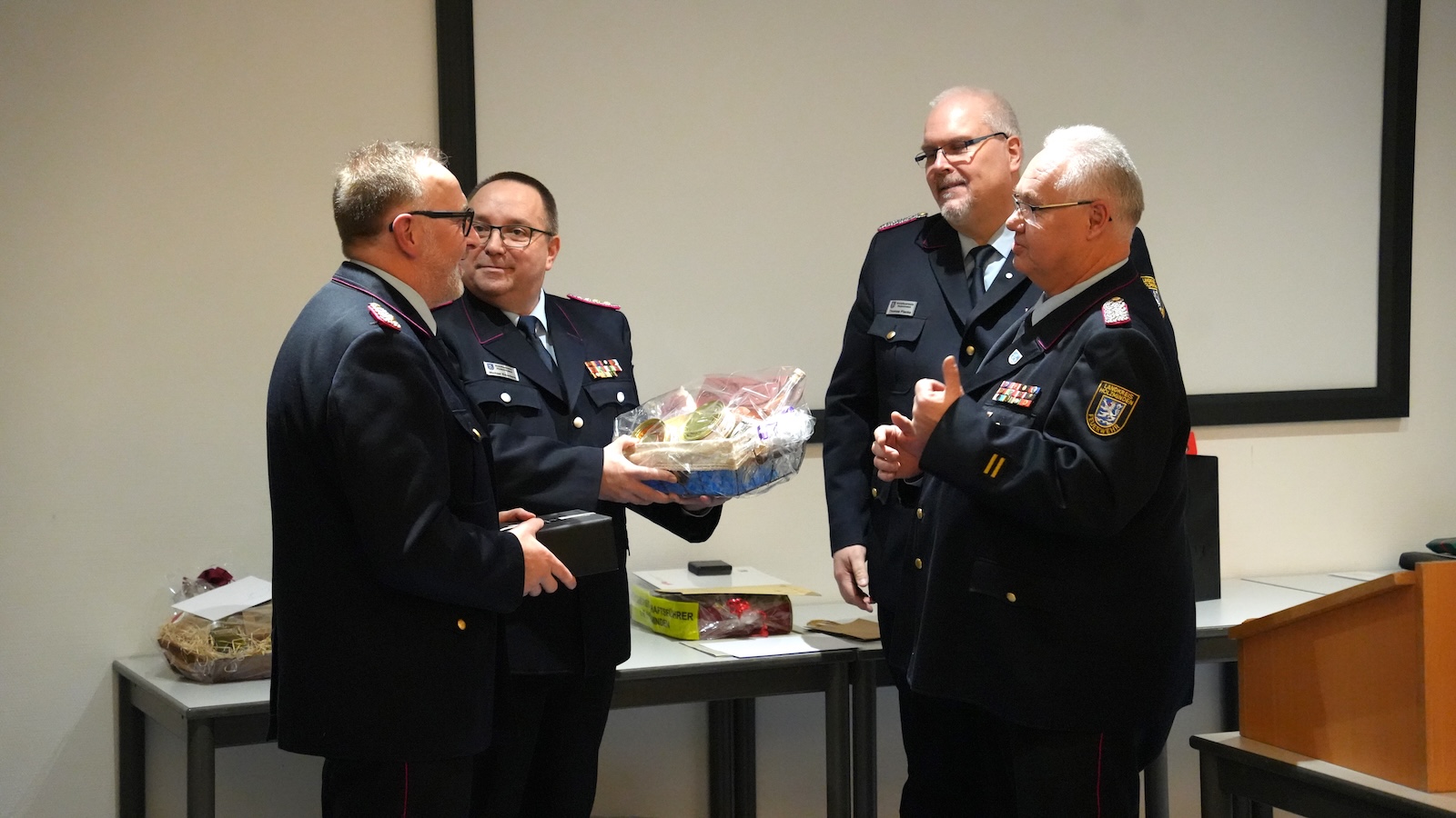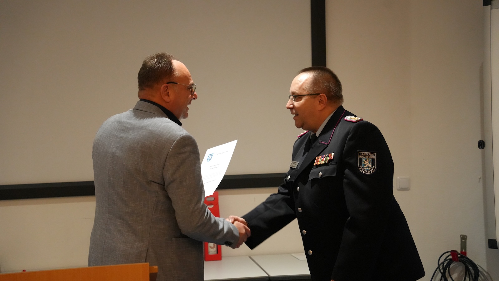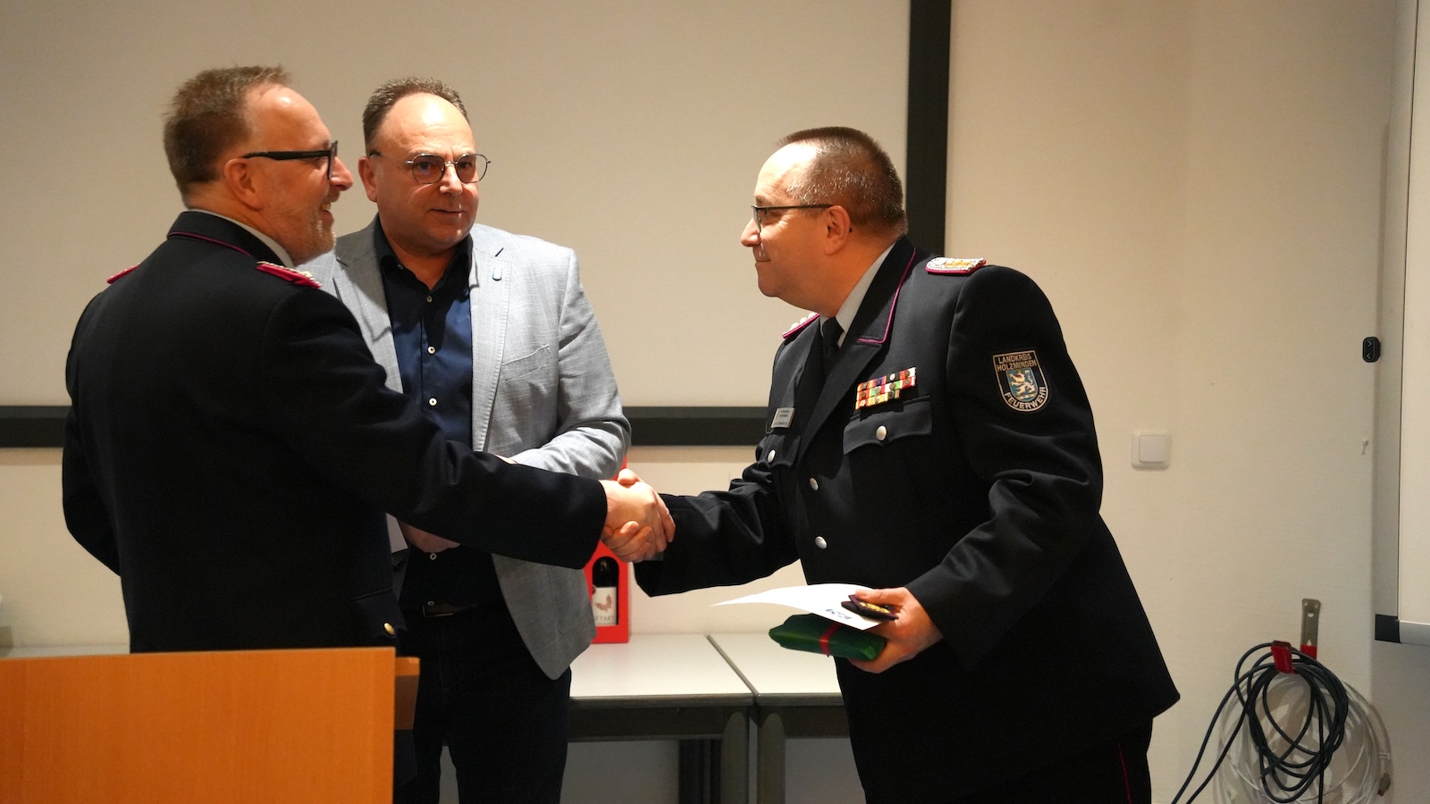 Holzminden (lbr). Am Montagabend, 22. Dezember, ist die Feuerwehrtechnische Zentrale feierlich an den neuen Kreisbrandmeister Michael Eisenbeis übergeben und der bisherige Amtsinhaber Jens Heinemeyer würdevoll verabschiedet worden. Zahlreiche Vertreter aus Feuerwehr, Verwaltung und Hilfsorganisationen waren zu der Veranstaltung gekommen.