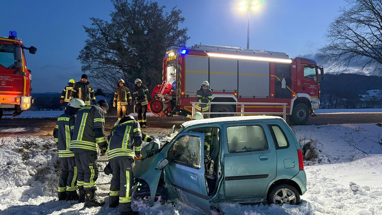Das Fahrzeug wurde bei dem Unfall schwer beschädigt. Der Fahrer wurde in seinem Pkw eingeklemmt und musste durch die Feuerwehr befreit werden. Zur weiteren medizinischen Behandlung wurde der Verletzte mit einem Rettungshubschrauber in eine Klinik geflogen. Für die Dauer des Einsatzes sowie der Unfallaufnahme und der Bergungsarbeiten war die Landesstraße am Morgen zeitweise voll gesperrt.