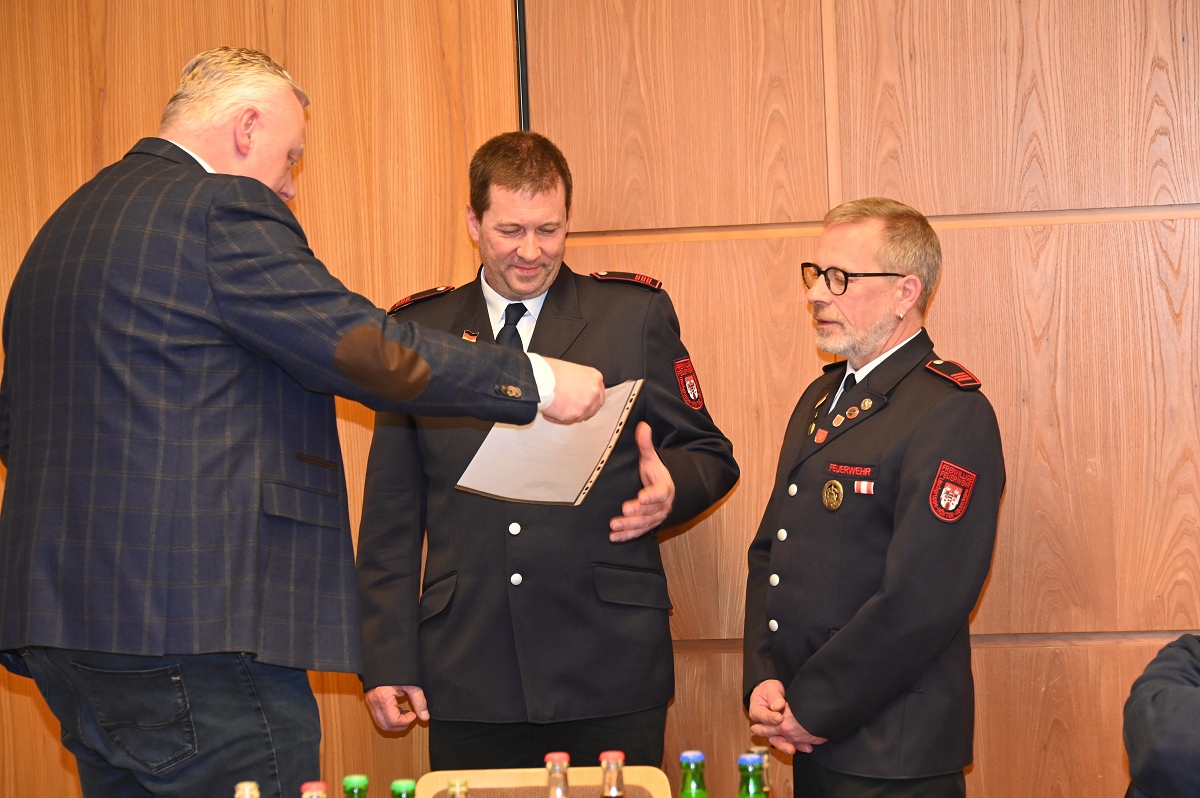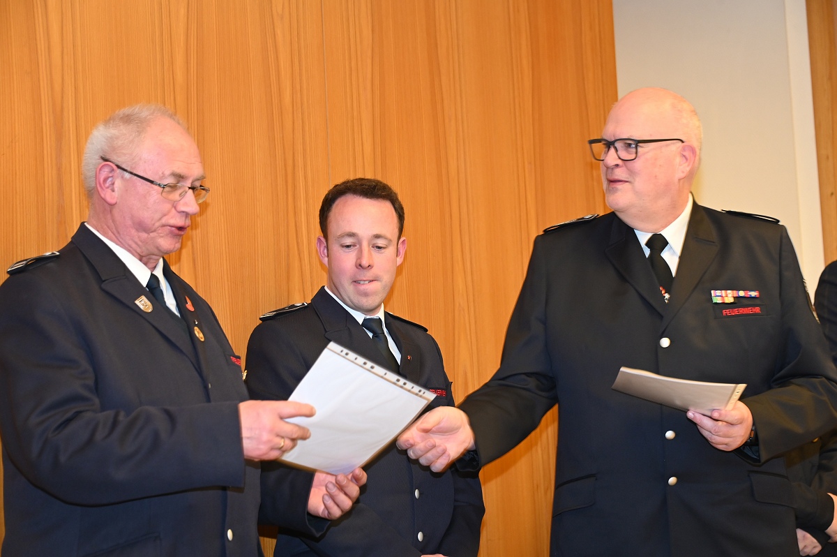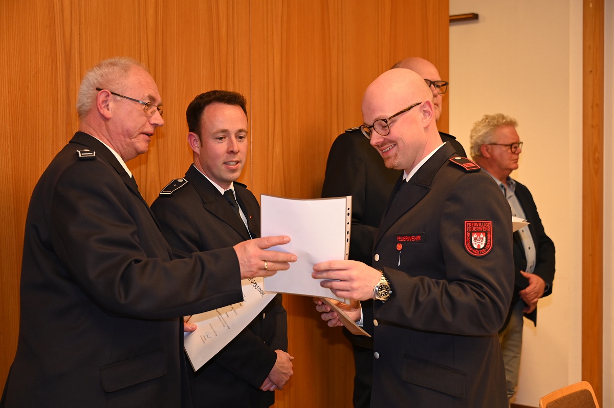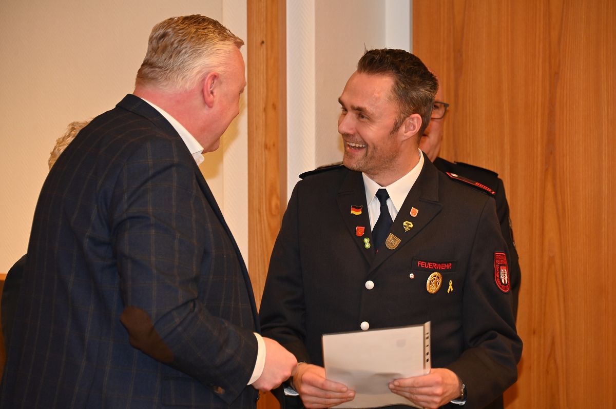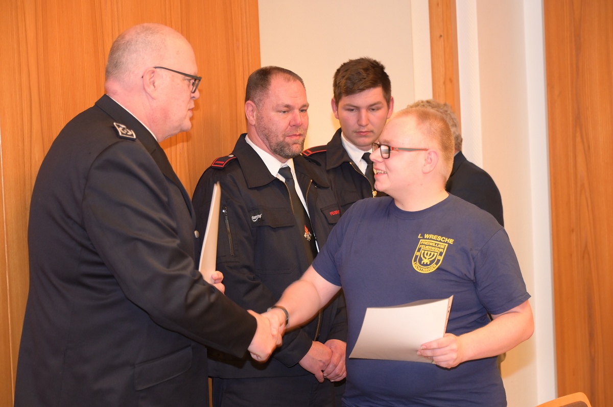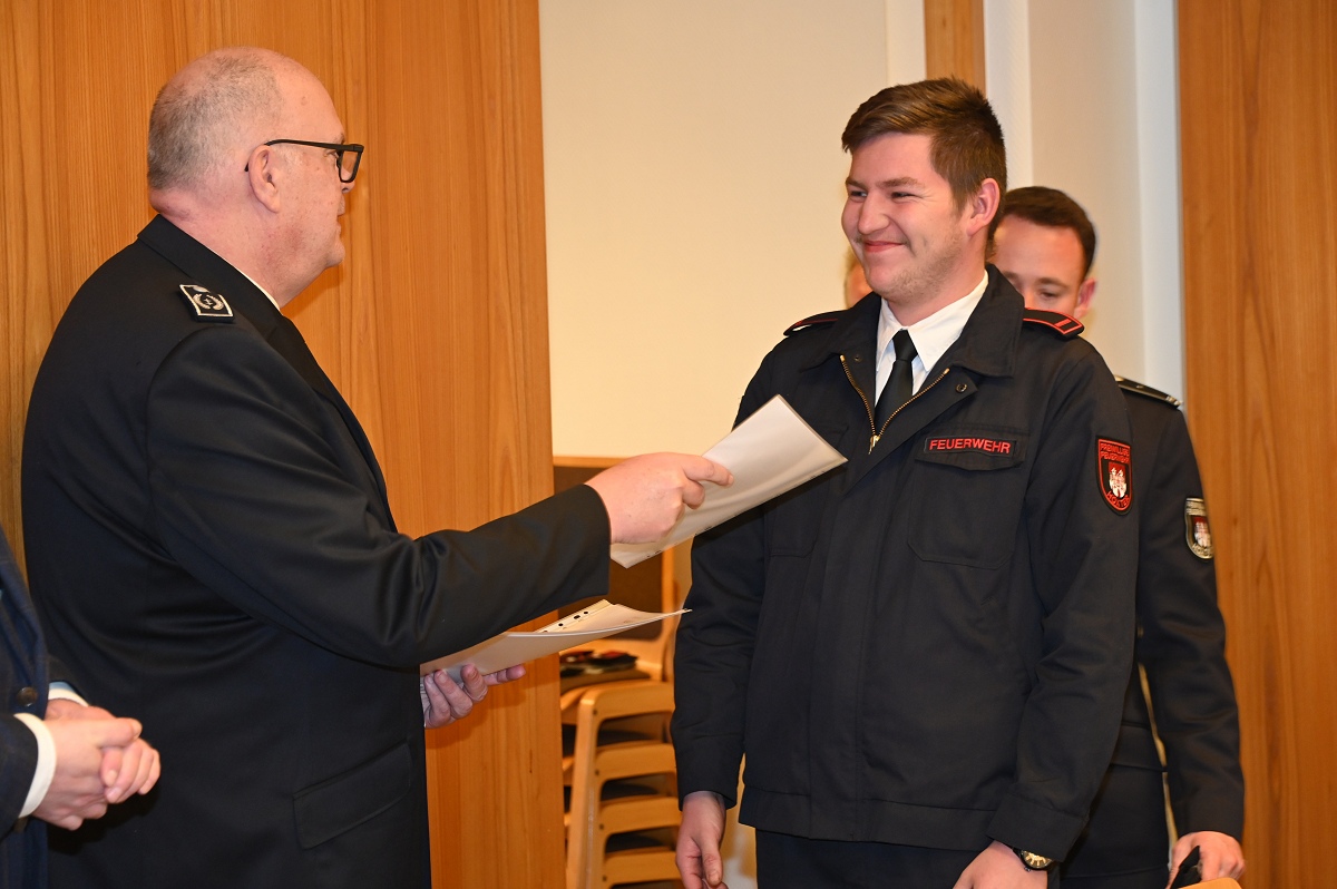 Auch Beförderungen standen auf der Tagesordnung. Zu Unterbrandmeistern wurden Anna Lena Becher, Benjamin Leiße und Noah Hesse befördert. Zum Oberfeuerwehrmann wurden Frederik Hamelmann und Carsten Olandt ernannt. Ingo Wittkowski und Leon Wresche erhielten die Ernennung zum Feuerwehrmann. Für die 30. erfolgreiche Teilnahme an Leistungswettkämpfen wurde Wolfgang Oppermann mit dem Leistungsabzeichen in Gold mit der Zahl 30 ausgezeichnet. Das silberne Leistungsabzeichen erhielt Anna Lena Becher.
