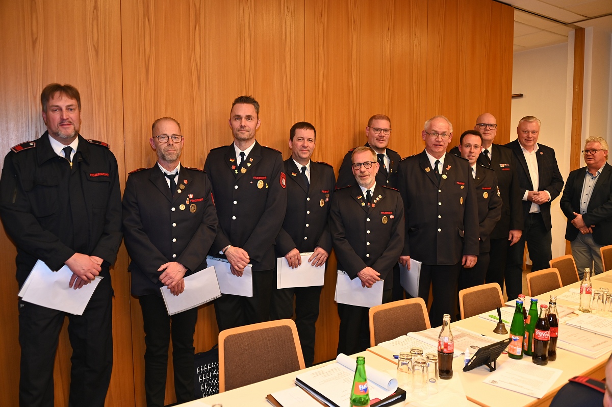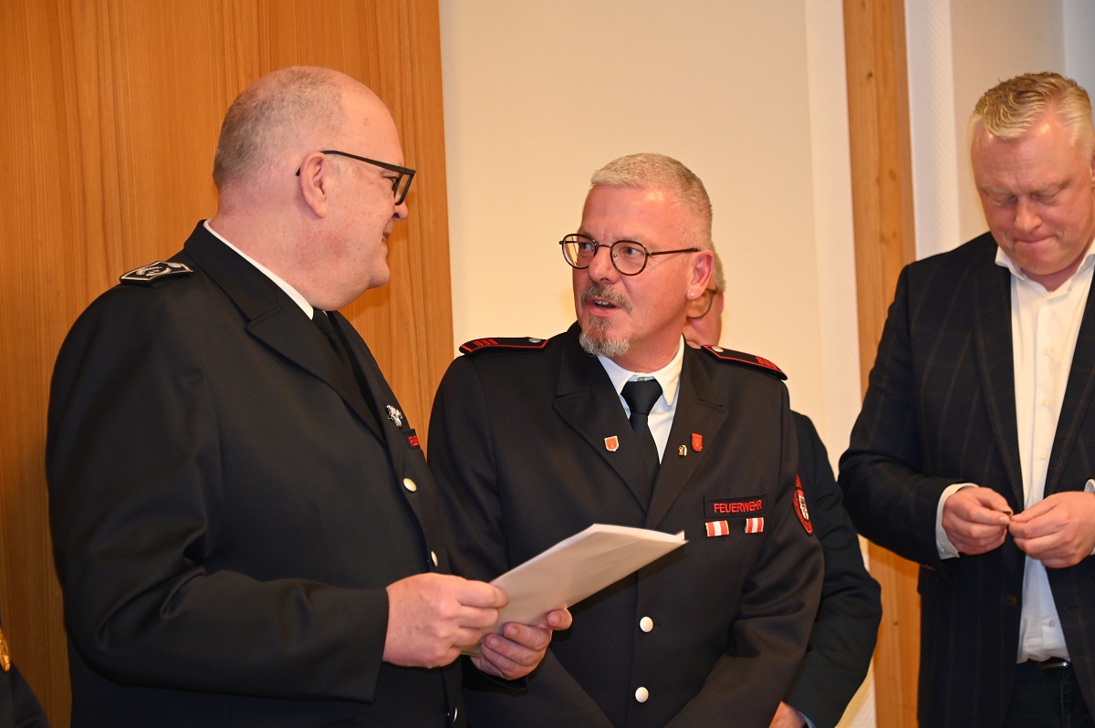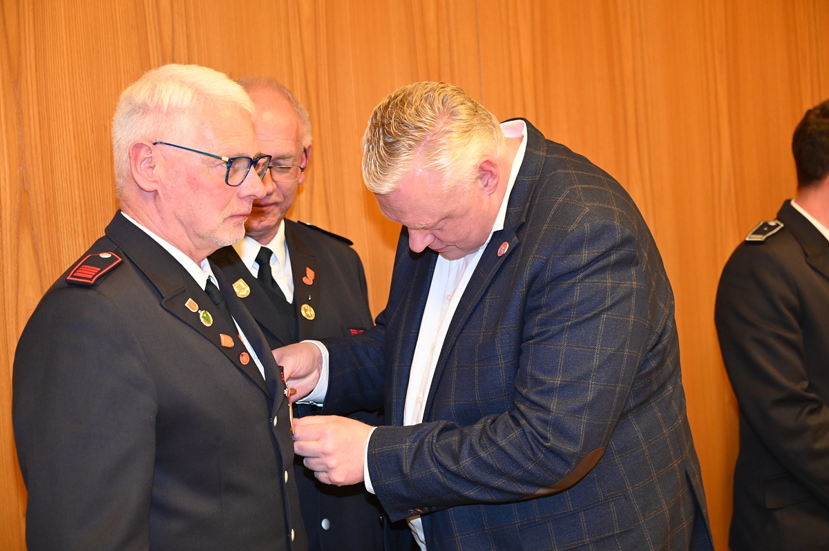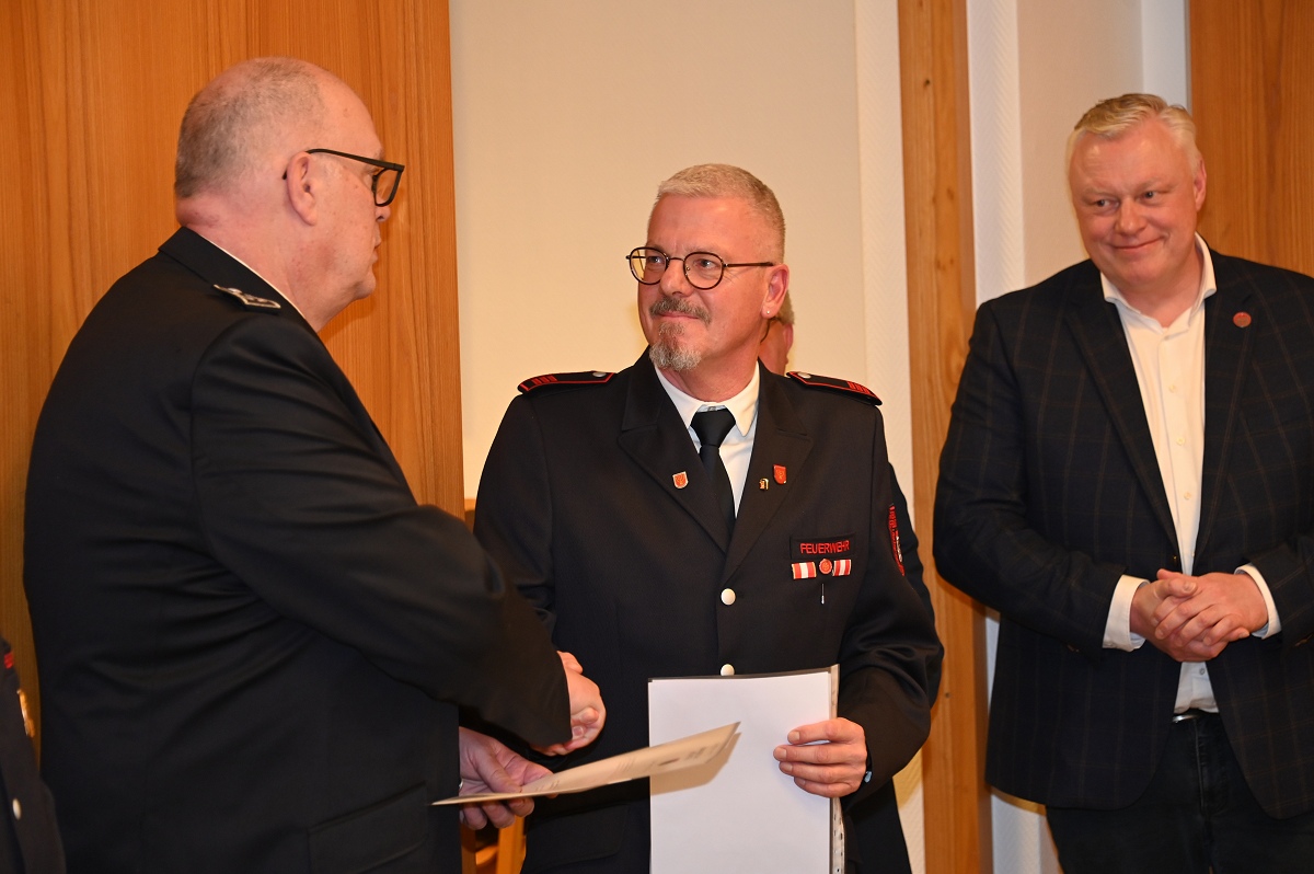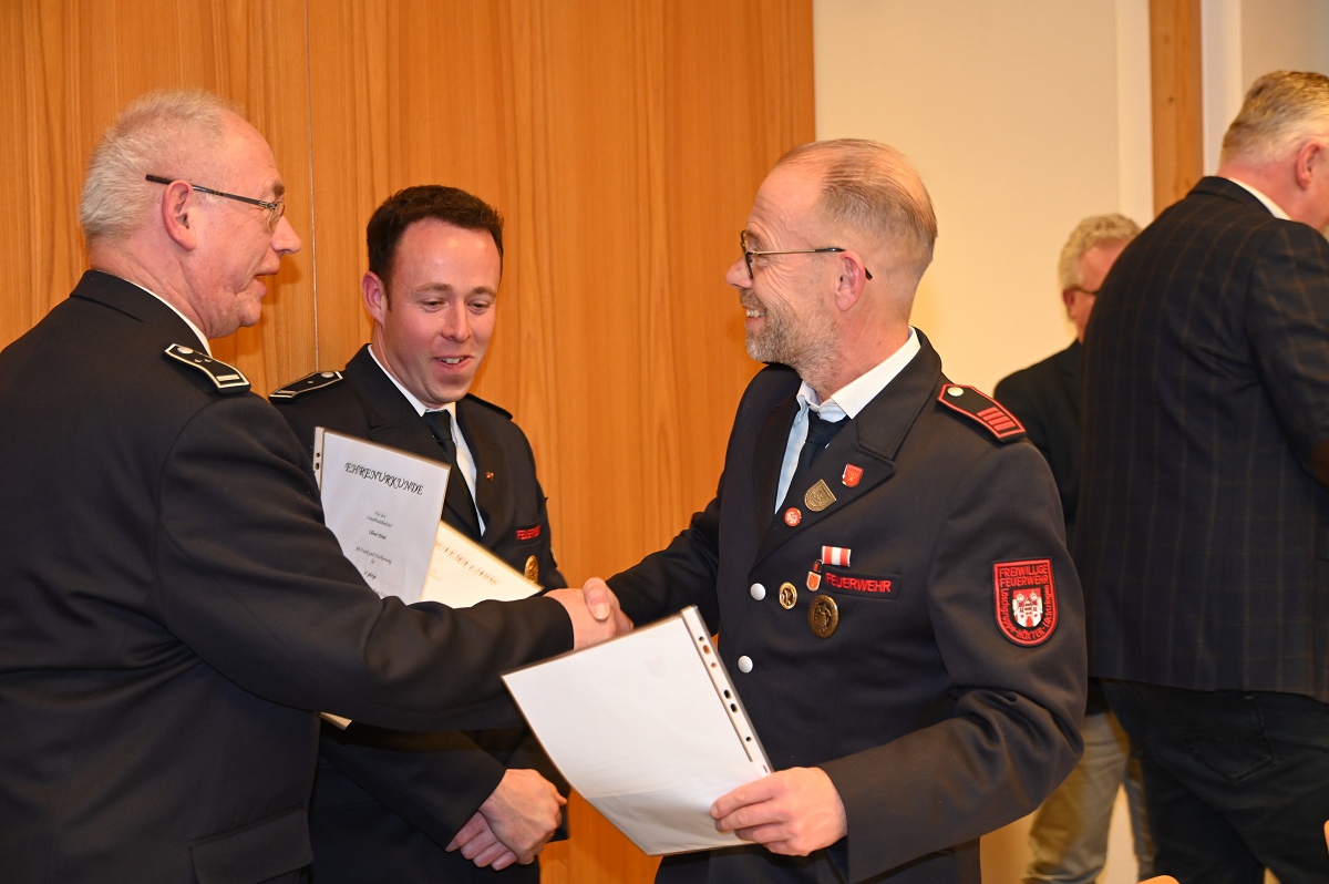 Im Anschluss folgten zahlreiche Ehrungen. Das Feuerwehrehrenzeichen des Landes Nordrhein-Westfalen in Gold verlieh Bürgermeister Daniel Hartmann an Hauptfeuerwehrmann Rolf Hillebrecht, Hauptbrandmeister Andreas Klie, Hauptfeuerwehrmann Jens Lippelt sowie Unterbrandmeister Oliver Heine. Das Ehrenzeichen in Silber für 25 Jahre aktiven Feuerwehrdienst erhielt Unterbrandmeister Sebastian Heine.