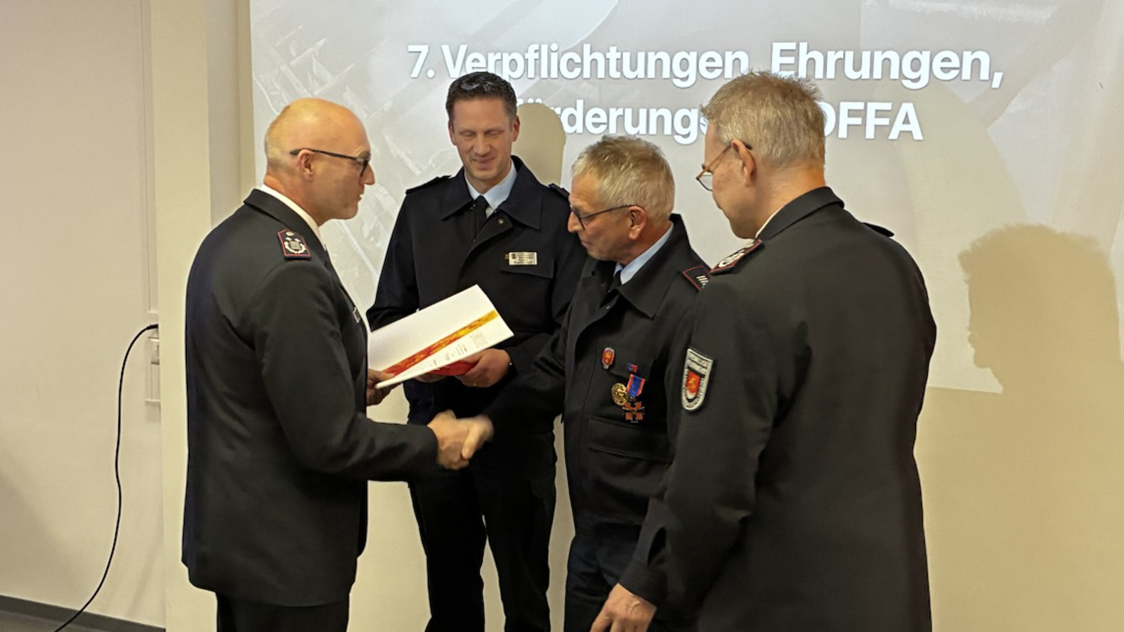 Nach mehreren Ehrungen und Beförderungen wurde insbesondere Fritz Kassebeere für seinen jahrzehntelangen Einsatz gewürdigt – sei es als Einsatzkraft, Führungskraft, Ausbilder oder mit seinen handwerklichen Fähigkeiten beim Neubau der Feuerwehr. Er durfte das Deutsche Feuerwehr-Ehrenkreuz in Bronze entgegennehmen.