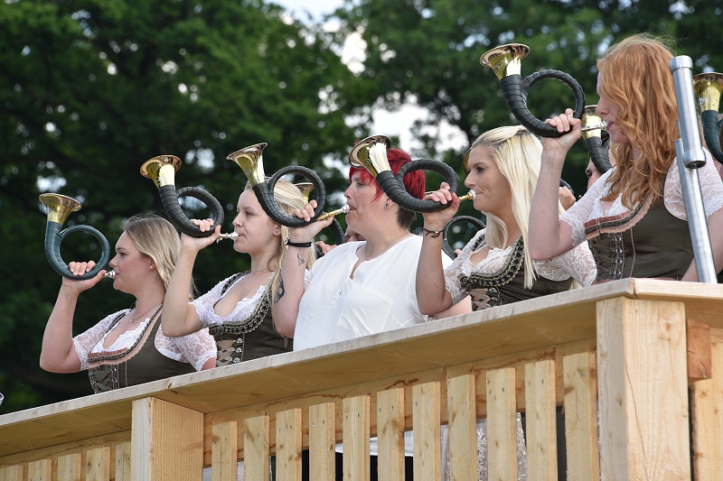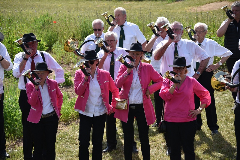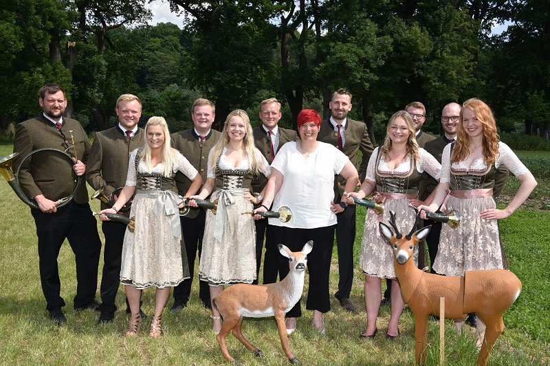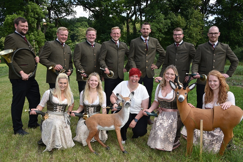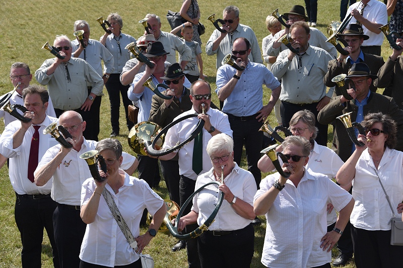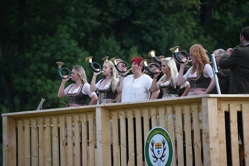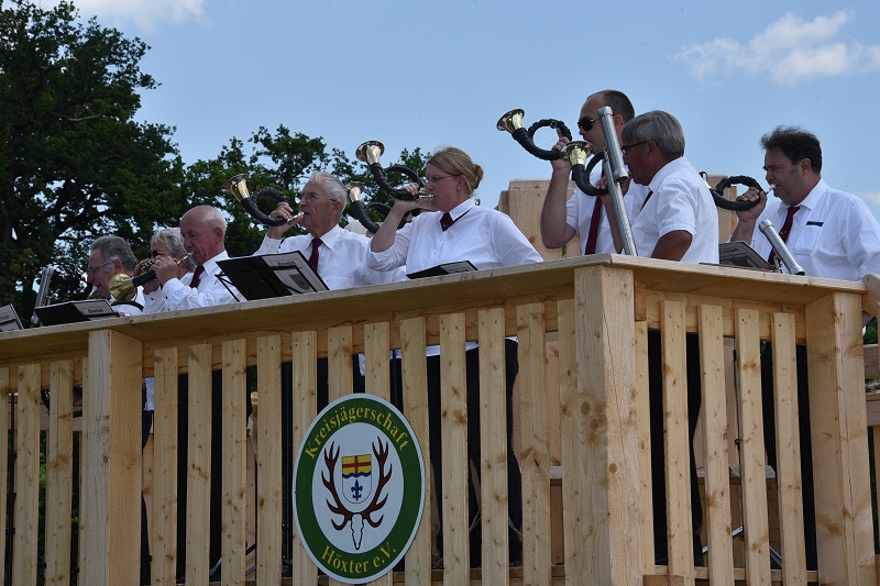 Höxter (TKu). Die Geschichte der Menschheit ist eine Geschichte der Jagd – oder mit anderen Worten: Die Jagd stand wahrscheinlich an der Wiege der menschlichen Kultur, wie man auf der Landesgartenschau von aktiven Jägerinnen und Jägern zu hören bekam. Kaum ein Bereich des Lebens sei seit der Urzeit so untrennbar mit der Musik verbunden, wie die Jagd. Und so erklang am Sonntag viele Stunden lang traditionelle Jagdmusik auf der Landesgartenschau in Höxter. Hinter dem großen Zelt bei „Wir vom Land“ fand am Sonntag mit 18 Bläsercorps aus dem ostwestfälischen Raum und dem südlichen Niedersachsen ein großes Jagdhornkonzert statt. „Der gemeinsame Auftritt der Bläsergruppen sei in dieser Dimension einzigartig gewesen“, erklärt Achim Frohss, Vorsitzender der Kreisjägerschaft Höxter. Und dabei ist das Jagdhornblasen längst nicht mehr nur Männersache – auch Damen-Truppen im Dirndl oder traditioneller Kleidung waren mit von der Partie. Gegen 16:30 Uhr erfolgte das große Finale, bei dem alle Bläsergruppen gemeinsam ein Lied anstimmten. „Das Singen, Musizieren und Jagdhornblasen beinhaltet einen lebendigen Teil der Jagdausübung, des weidmännischen Empfindens und des jagdlichen Brauchtums. Wo immer sich Jäger und Jagdfreunde zusammenfinden, wird gesungen, musiziert und die Jagdhörner ertönen“, wußte ein Jägersmann auf der LGS zu berichten. Die Gäste waren begeistert von der Musik, die vom einfachen Signal, bis hin zum konzertanten Jägermarsch reichte, von deutscher über österreichischer bis hin zu französischer Jagdmusik.