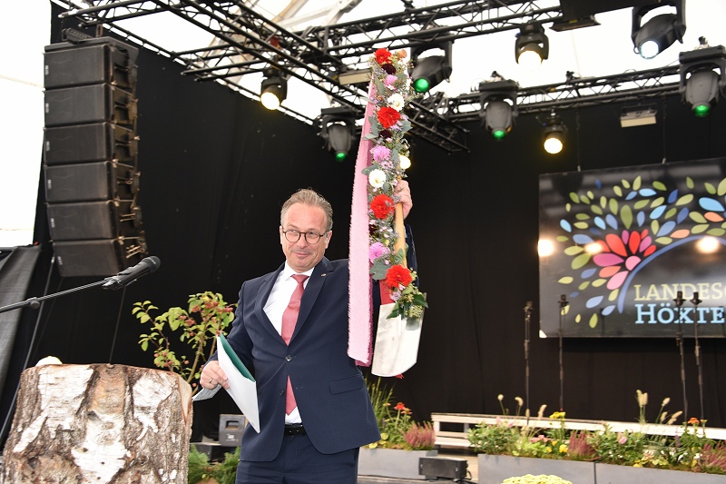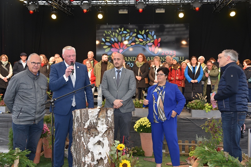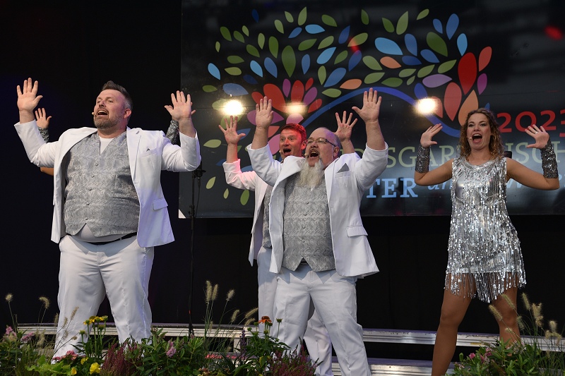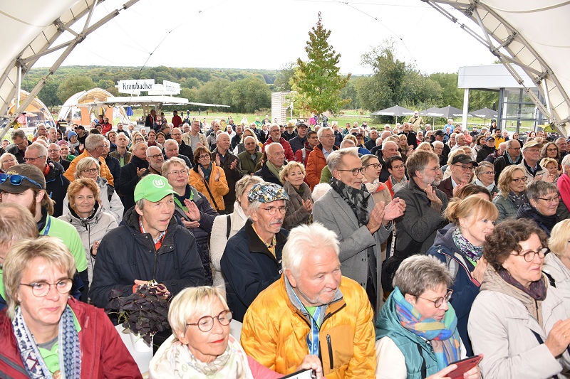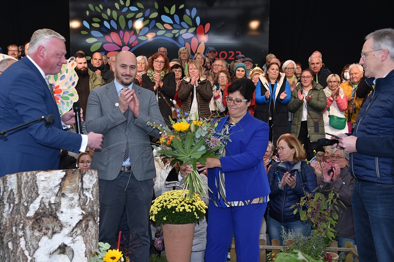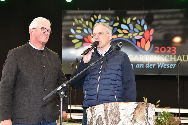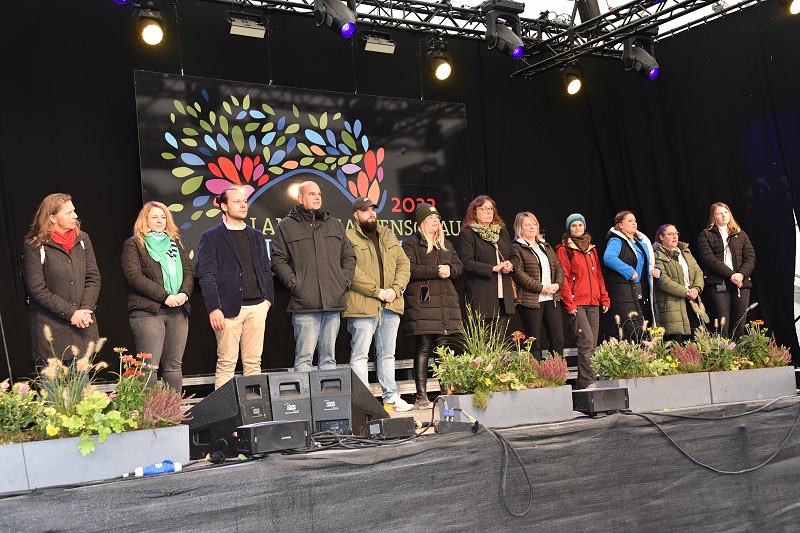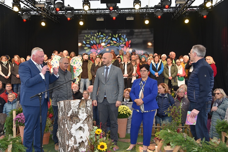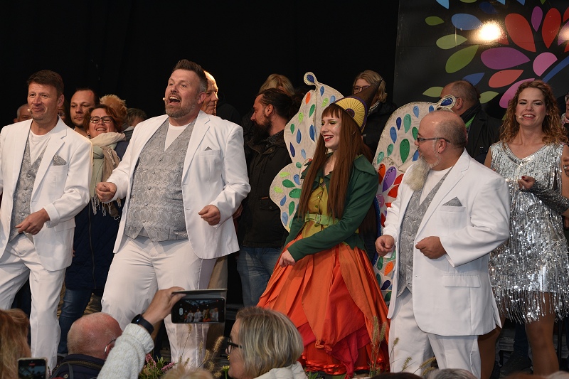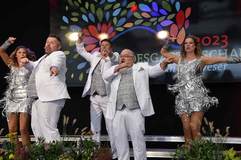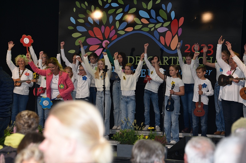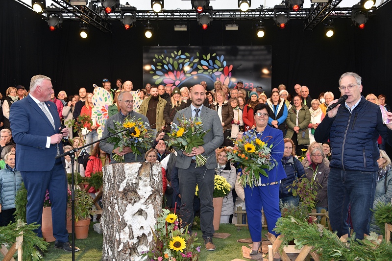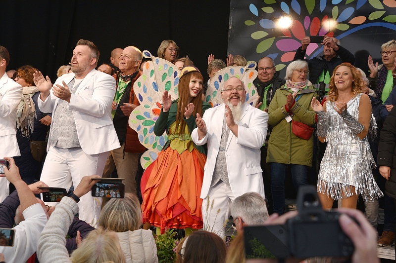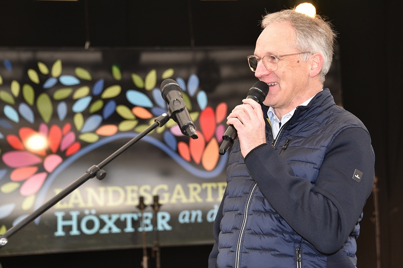 Unter der Moderation von Hochstift-Moderator Martin Lausen ließen die Verantwortlichen auf der Bühne das „Höxteraner Sommermärchen 2023“ noch einmal Revue passieren. Neben der Blumenpracht erinnerte Daniel Hartmann an viele Events des Kultur- und Veranstaltungsprogramms, das mehr als 1.000 Events in den sechs Monaten beinhaltete, was einer Großstadt ebenbürtig sei, wie er selbstbewusst betonte. Was sie am meisten bewegt oder ihnen an der LGS gefallen habe, fragte Martin Lausen die LGS-Geschäftsführer Claudia Koch und Jan Sommer sowie den Vorsitzenden des LGS-Fördervereins, Thomas Schöning. Während Jan Sommer der Remtergarten am meisten gefallen hat, so war es bei Thomas Schöning der Platz der Ortschaften, wo alle Ortsteile von Höxter die Möglichkeiten erhalten hatten, sich von ihrer schönsten Seite zu zeigen. Bei Claudia Koch sei es ein erst kürzliches Erlebnis gewesen bei einem zufälligen Zusammentreffen mit einer der größten Kritikerin der LGS, die ihre Meinung inzwischen geändert habe und Koch zur gelungenen Landesgartenschau gratuliert hatte, was sie nach eigenen Angaben sehr gerührt habe. Zum Abschluss sangen mehr als 700 Menschen unter dem Spannbau der Expert-Bühne gemeinsam mit allen Verantwortlichen und mit Sänger Sebastian Hegener sowie dem Team vom Schlosstheater Fürstenberg, die während der Abschlussveranstaltung ebenso wie die ehemaligen Grundschüler aus Ottbergen für die musikalische Untermalung des Rahmenprogramms gesorgt haben, lautstark das Landesgartenschau-Lied „Höxter ist unser Ding“.