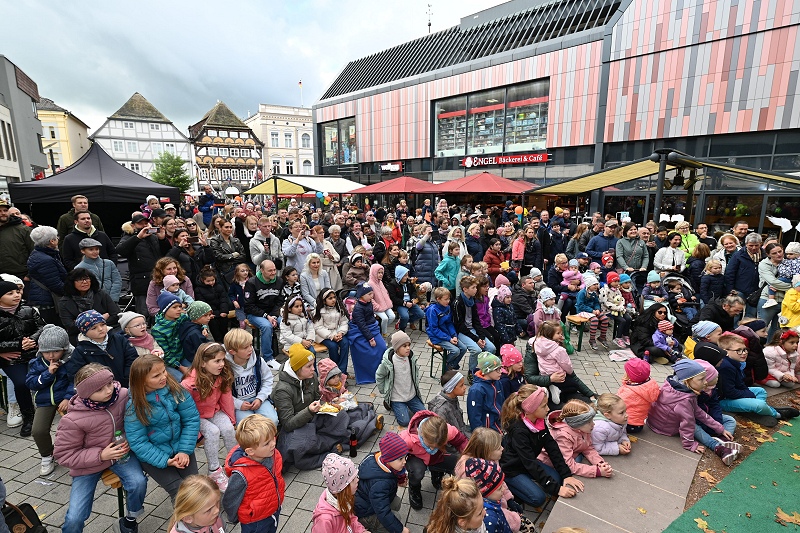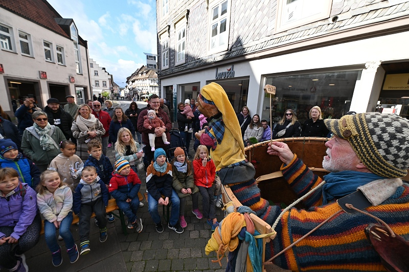 Höxter (TKu). Auch nach fast 30 Jahren hat der Höxteraner Märchensonntag nichts von seinem Zauber verloren. Mit der Märchenlesung vom „Hasen und Igel“ nach den Gebrüdern Grimm startete der 28. Höxteraner Märchensonntag nach der offiziellen Eröffnung mit allen Akteuren, der Werbegemeinschaft und der stellvertretenden Bürgermeisterin Andrea Dangela auf dem Marktplatz in Höxter. Wieder hat sich die Höxteraner Innenstadt in eine ganzheitliche Märchenmeile verwandelt. Nicht nur Kinder, sondern alle Märchenliebhaber sind am vergangenen Sonntag auf ihre Kosten gekommen bei den Märchenlesungen, den Märchenspielen und den vielen Märchenacts und Mitmachprogrammen an jeder Ecke.