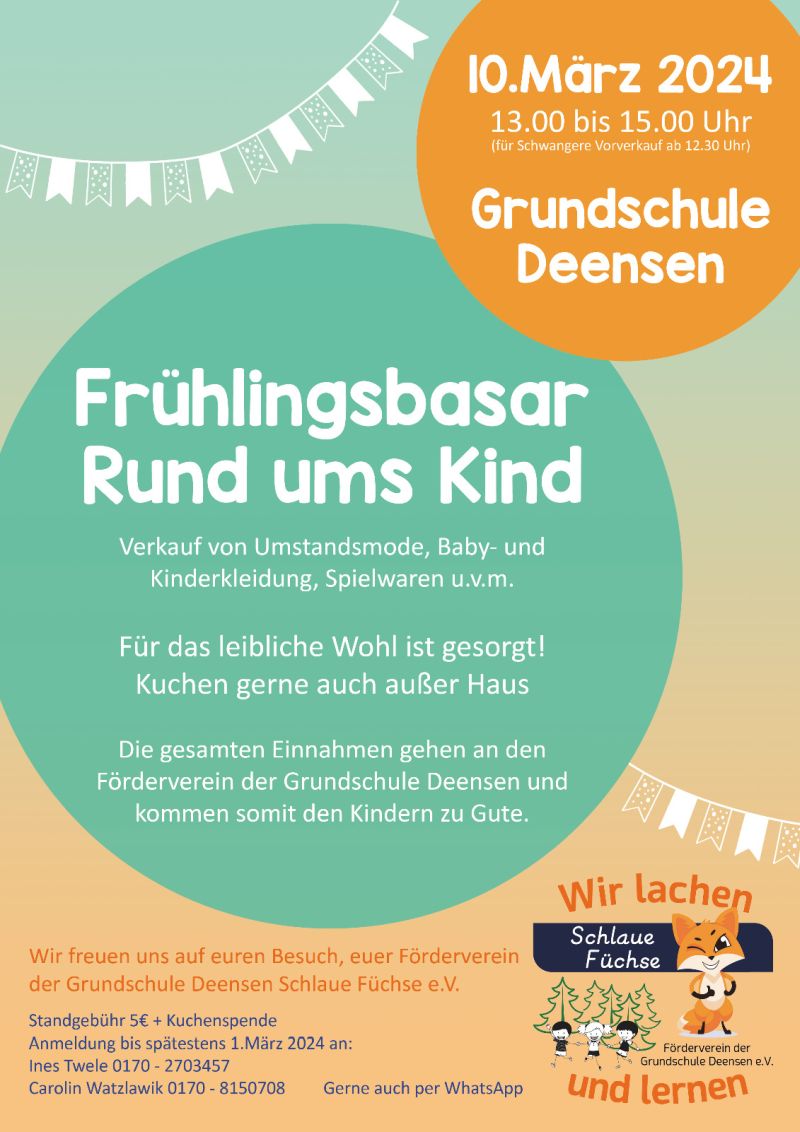 Deensen (red). Am Sonntag, 10. März, findet von 13 bis 15 Uhr der Frühlingsbasar - Rund ums Kind - in der Aula der Grundschule am Nordsolling, Schulstraße 9, in Deensen statt. Für Schwangere öffnen sich die Türen bereits um 12.30 Uhr. Der Förderverein Schlaue Füchse e. V. freut sich auf viele Besucher, für die ein vielseitiges Kuchenbuffet bereitsteht. Die Einnahmen durch den Kuchenverkauf werden dieses Jahr für die Anschaffung von digitalen Endgeräten für die Grundschüler verwendet. Zudem bittet der Förderverein dieses Jahr um Buchspenden für die Schulbücherei. Gut erhaltene Bücher für Kinder im Alter von 6 bis 12 Jahren können gerne in der Schule abgegeben werden.