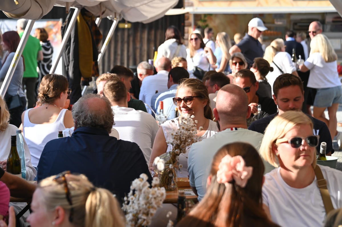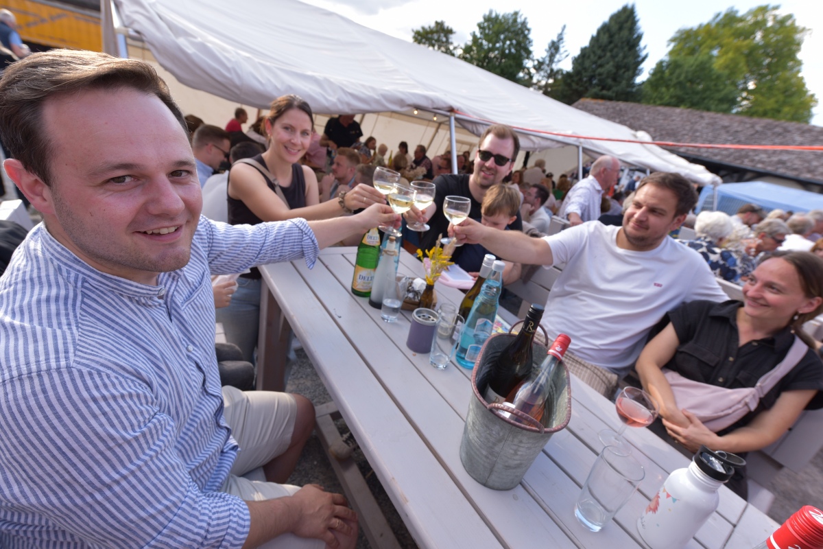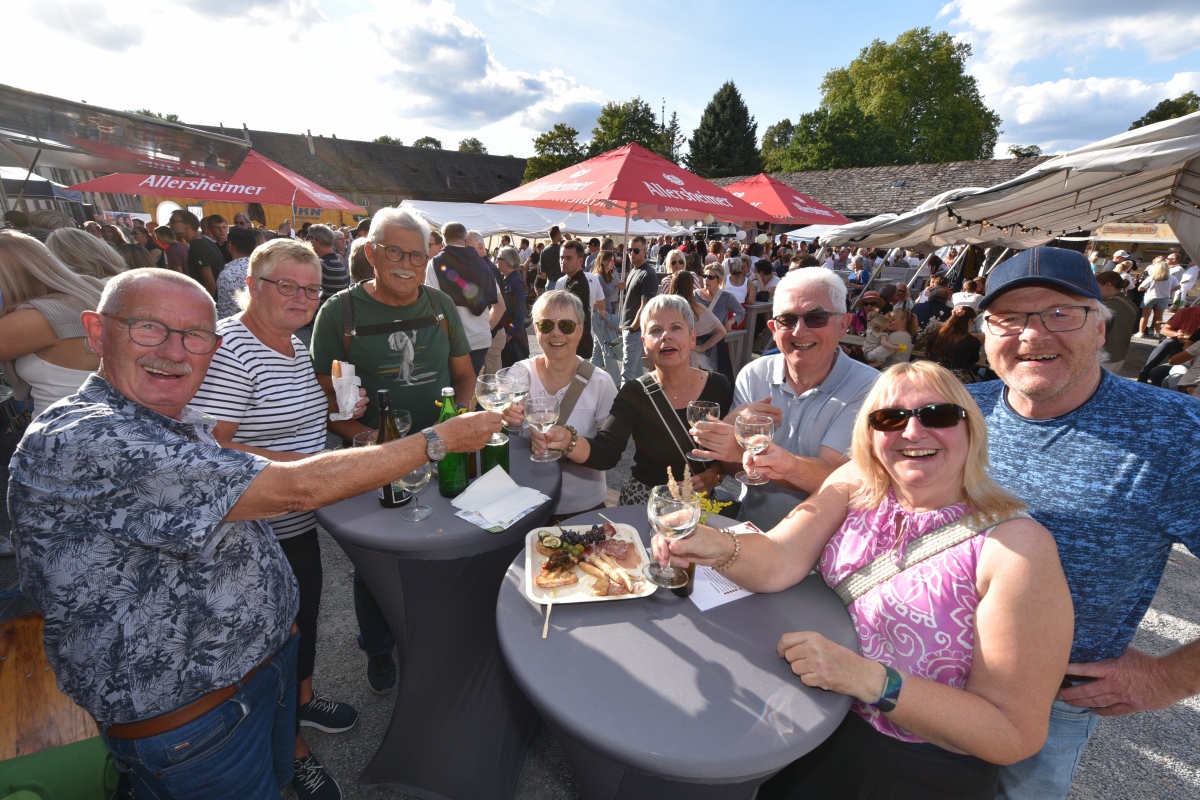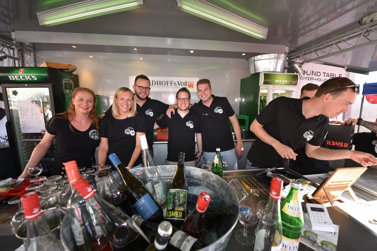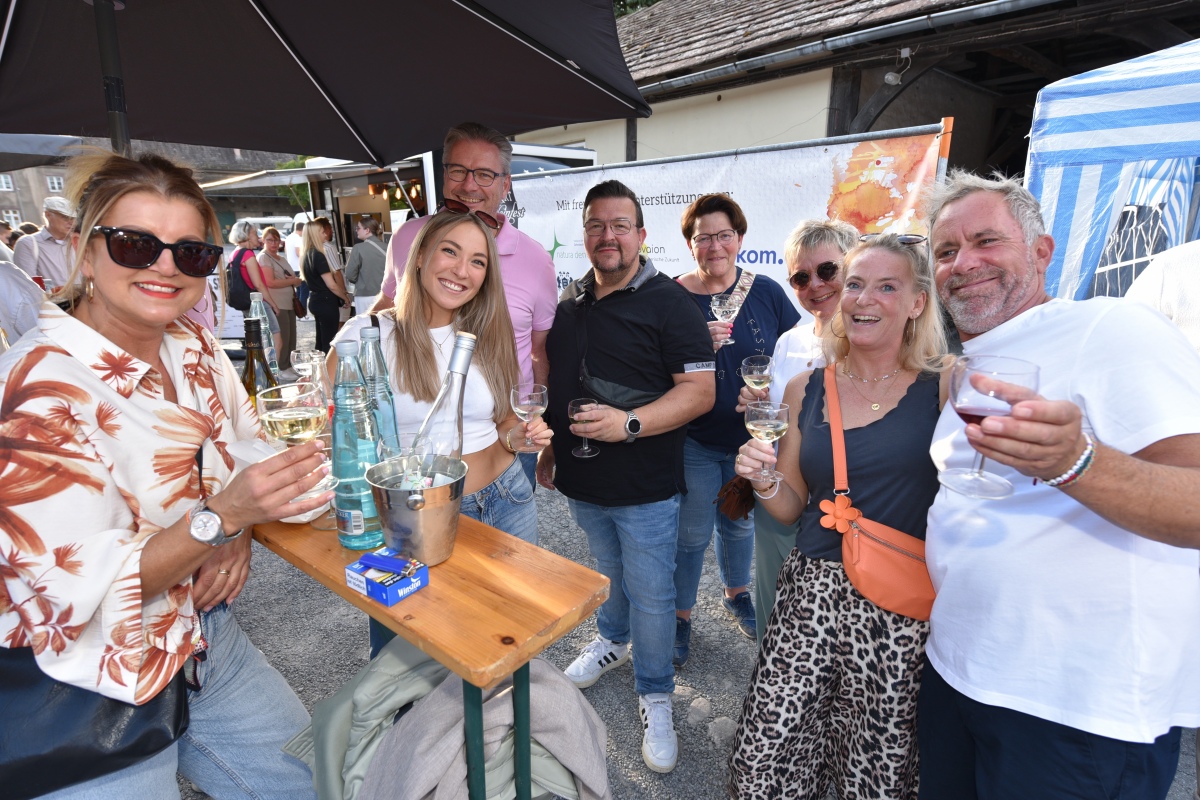 Höxter (TKu). So viele Gäste wie noch nie zog das Benefiz-Weinfest am vergangenen Samstag in den Corveyer Domänenhof: Geschätzt mehr als 1.000 Besucherinnen und Besucher genossen bei strahlendem Sonnenschein, gutem Wein, kulinarischen Spezialitäten und stimmungsvoller Musik das Weinfest. 1.003 Weinflaschen gingen über die Theke – im Vorjahr waren es 630. Bereits vor 16 Uhr strömten die ersten Gäste auf das Gelände vor dem Corveyer Weinhaus. Zum siebten Mal luden die Serviceclubs Ladies’ Circle 64 Höxter-Holzminden und Round Table 150 Höxter-Holzminden zu dem Fest ein, das bereits zum vierten Mal in der historischen Kulisse des Domänenhofs stattfand. „Bei traumhaftem Wetter und in malerischer Umgebung mit Blick auf das imposante Westwerk von Corvey bot sich eine ideale Atmosphäre“, meinte eine Besucherin und ergänzte: „Die Atmosphäre des Domänenhofs passt perfekt zum Weinfest.“