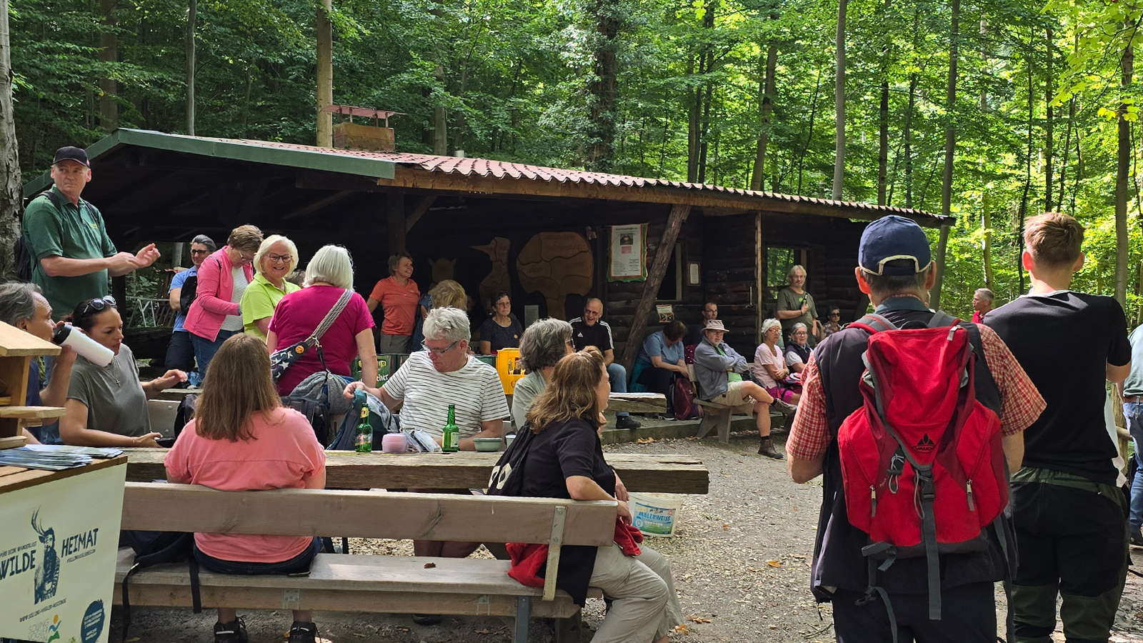Ein besonderes Highlight erwartete die Wandergruppe an der Braunschweiger Hütte: Der Geschäftsführer der Solling-Vogler-Region (SVR), Manuel Liebig, begrüßte die Teilnehmenden persönlich und überreichte einen exklusiven Sonderstempel für den Wandertag. Viele Wanderfreunde nutzten die Gelegenheit, vor Ort Stempelhefte zu erwerben und Abzeichen für ihre gesammelten Stempel zu erhalten. Zusätzlich wurden kleine Präsente wie Schlüsselanhänger, Zeckenkarten und Pins verteilt – begleitet von spannenden Informationen zur Qualitätswanderregion SVR.