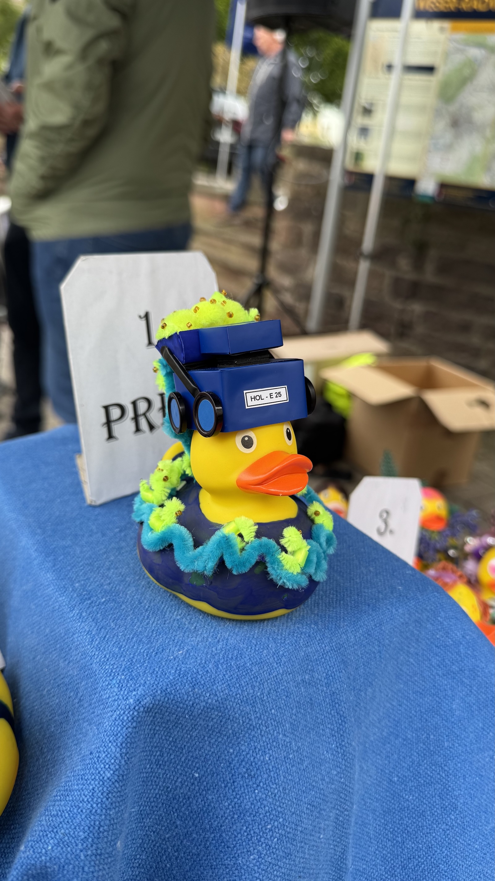 Noch beim Aufbau nieselte es, doch pünktlich zum Start des ersten Rennens „Klein gegen Groß“ brach die Sonne durch. Zehn Kinder traten gegen zehn Erwachsene an – ein Kopf-an-Kopf-Rennen bis zur Ziellinie. Am Ende jubelte der kleine Elia: Seine Ente Nummer 9 machte das Rennen.