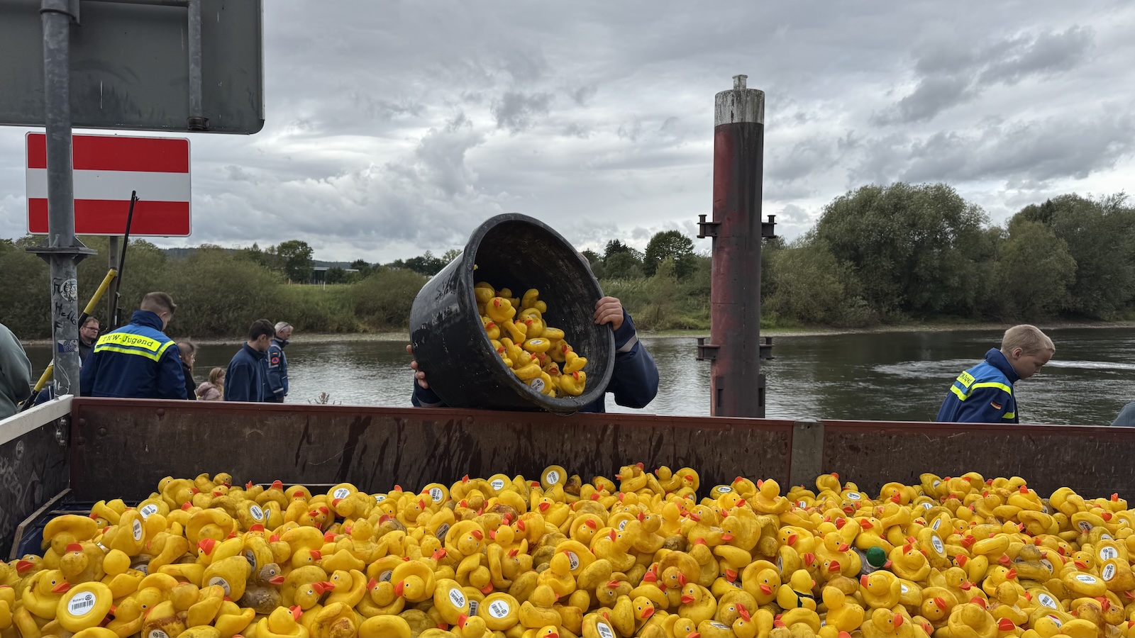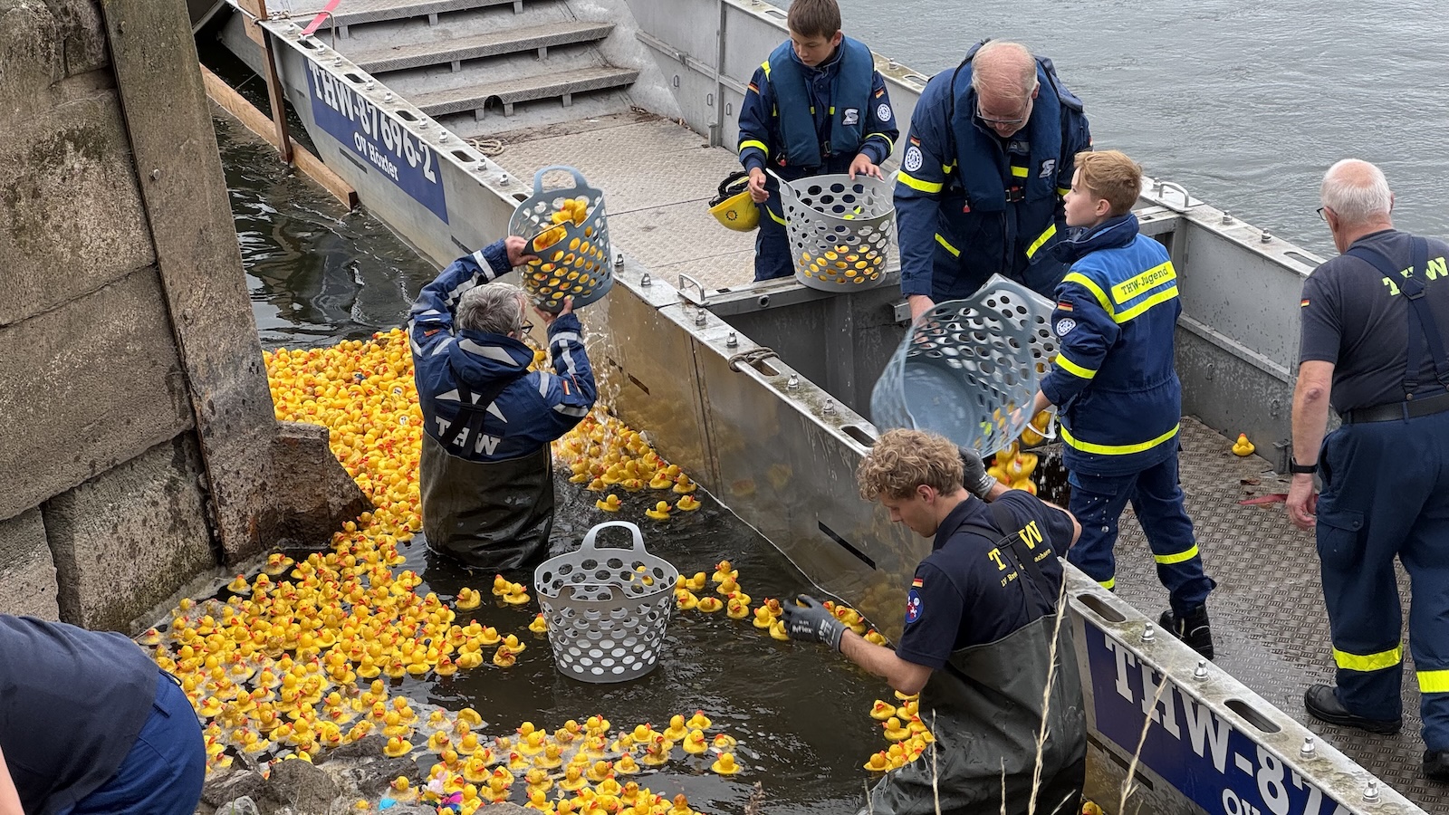 Das Highlight des Tages war wie immer das Hauptrennen. Knapp 4000 Enten plumpsten gleichzeitig von der Weserbrücke ins Wasser – ein gelbes Spektakel, überwacht per Drohne vom THW. Damit keine Ente verloren ging, sammelten fleißige Helfer die Tiere am Ziel mit Wäschekörben wieder ein.