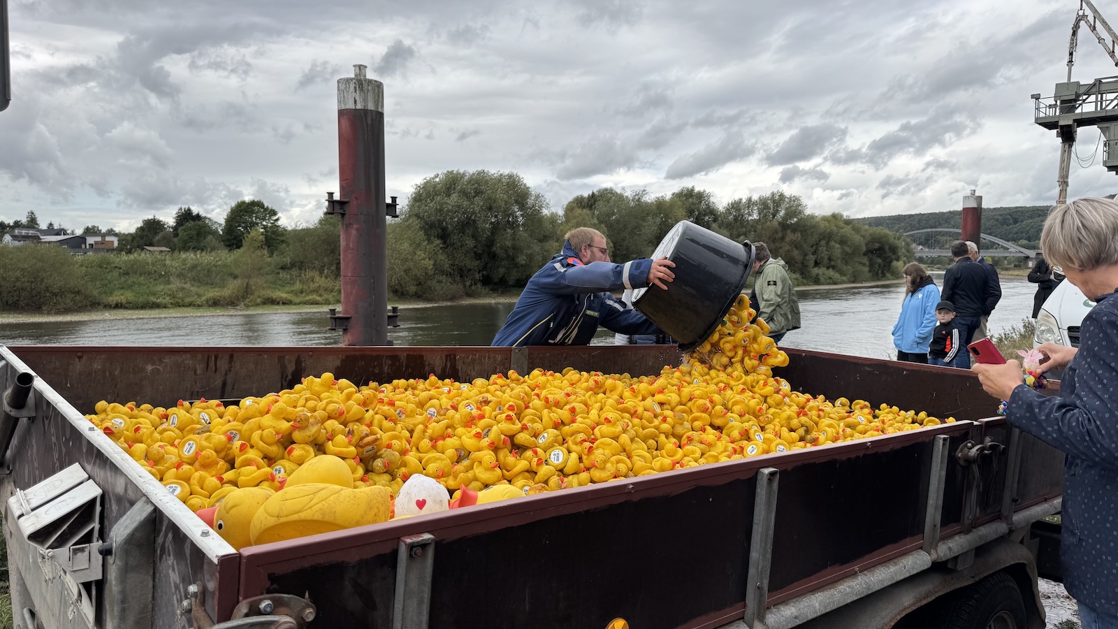 Holzminden (msp). Gelb, fröhlich, schwimmstark: Am Samstag, 13. September, war die Weser in Holzminden wieder fest in Entenhand. Genauer gesagt: in 3860 kleinen, nummerierten Quietscheenten, die beim traditionellen Entenrennen des Rotary-Clubs Holzminden ins Wasser gingen.