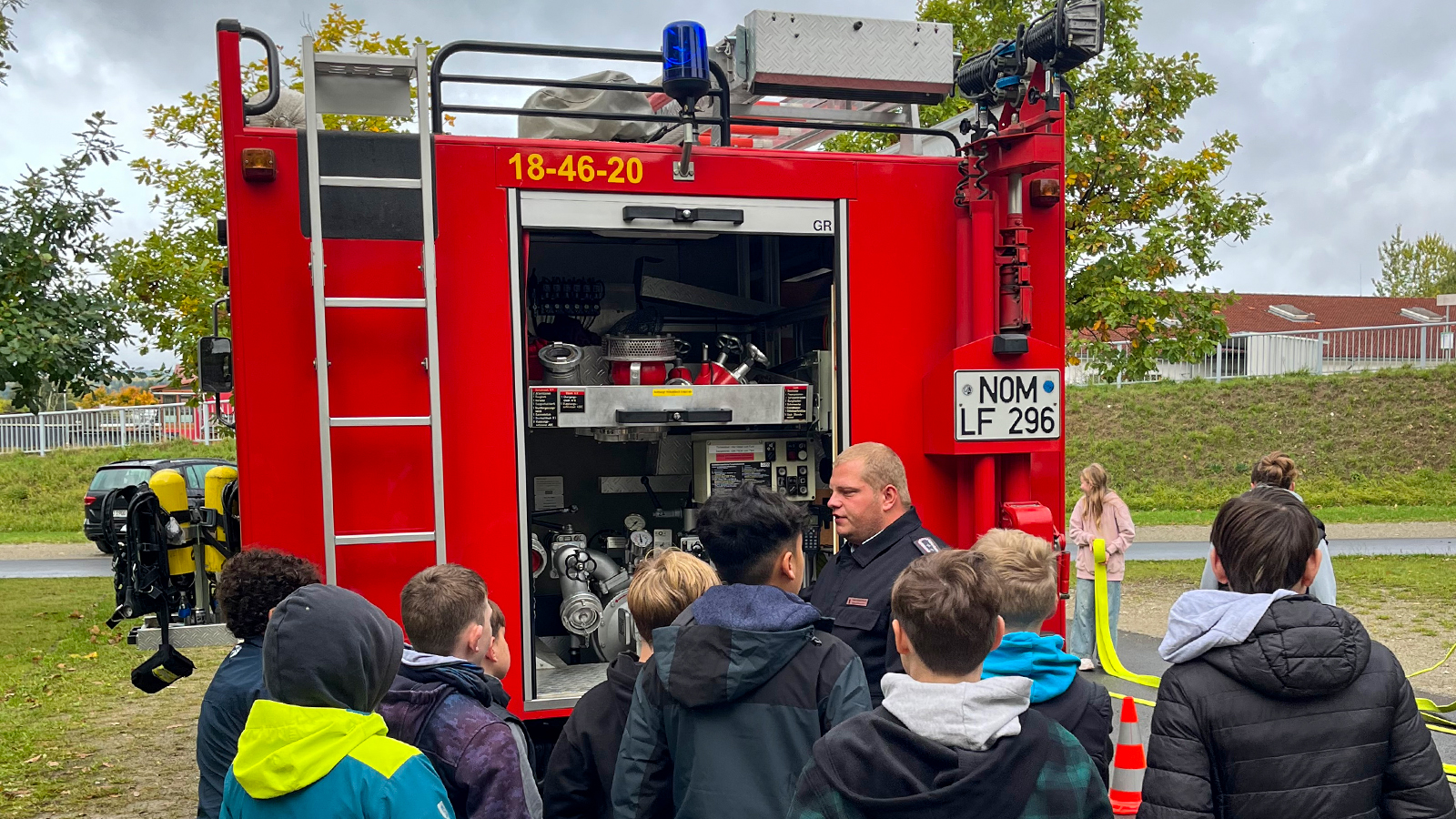 Besonders spannend war das Löschfahrzeug. Die Schülerinnen und Schüler durften Schläuche ausrollen, ausprobieren und inspizieren, im Fahrzeug Platz nehmen und Atemschutzmasken anprobieren. Auch die Ausstattung mit sechs Chemikalienschutzanzügen wurde gezeigt.