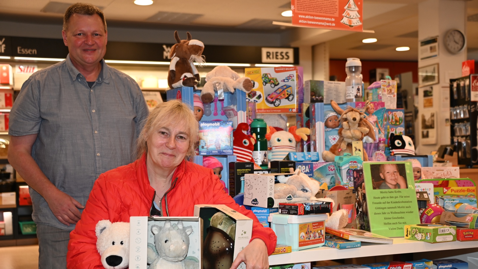 Höxter (TKu). Ein liebevoll gedeckter Tisch voller Spielwaren zieht derzeit die Blicke der Kundinnen und Kunden im Haushalts- und Spielwarengeschäft Larusch an der Weserstraße in Höxter auf sich. Zwischen Barbiepuppen, Brettspielen und Pokémon-Artikeln hat die „Löwenmama“ Susanne Saage aus Nieheim-Sommersell auch in diesem Jahr wieder ihre Weihnachtsaktion für schwerkranke Kinder gestartet. Was heute eine bundesweit bekannte Herzensinitiative ist, begann vor 24 Jahren genau hier im Geschäft von Dietmar Larusch.