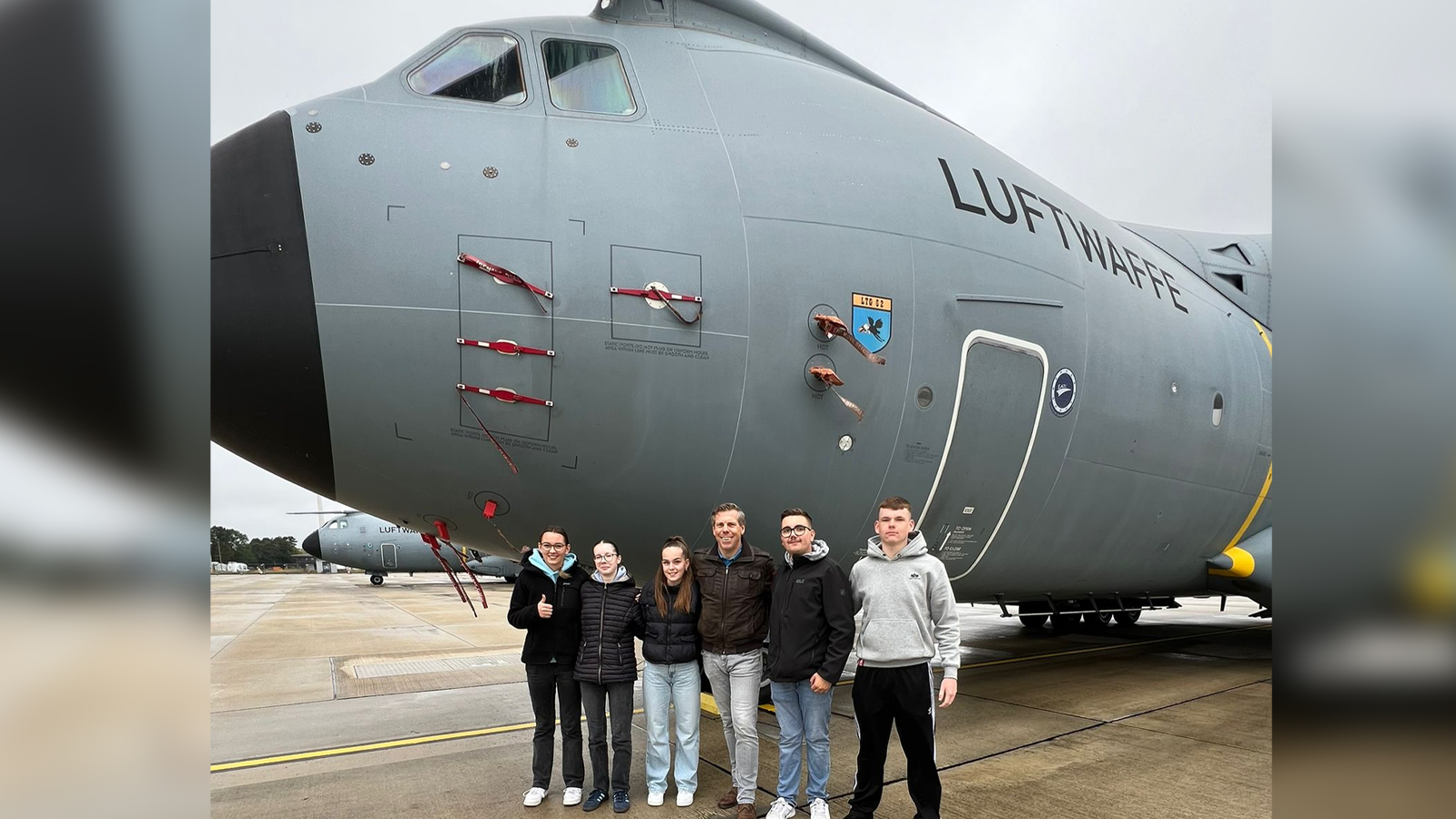 Das absolute Highlight erlebten die Schülerinnen und Schüler am Dienstag: Gemeinsam mit einem Piloten und einem Technischen Ladungsmeister erkundeten sie den A400M ganz genau und durften sogar auf den Pilotensitzen im Cockpit Platz nehmen. Am Nachmittag folgte eine besondere Ehre: Sie durften gemeinsam mit einem Piloten im Displaysimulator des A400M einige virtuelle Platzrunden drehen.