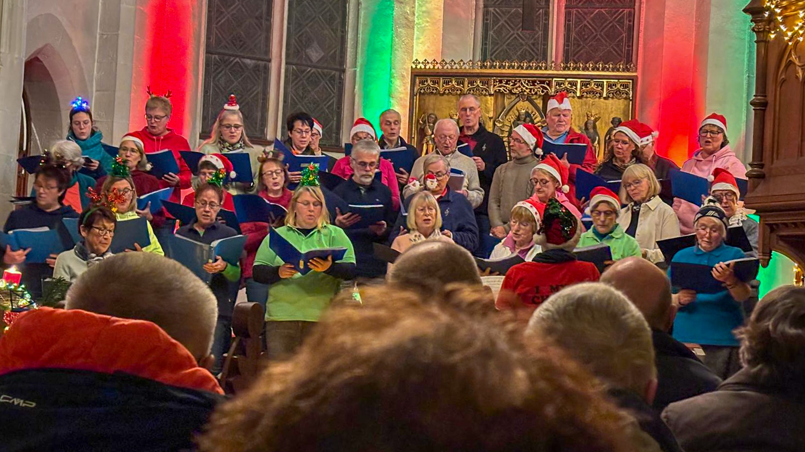Ein weiterer Höhepunkt war der Solopart der Männer- und Altstimmen mit dem Lied „Der perfekte Weihnachtsmoment“ von Max Raabe. Begleitet von Katrin Feichtinger auf der Ukulele klatschte das Publikum beim eingängigen Refrain begeistert mit. Danach trug der gesamte Chor gemeinsam das Lied „Trotzdem ist Weihnachten“ vor.