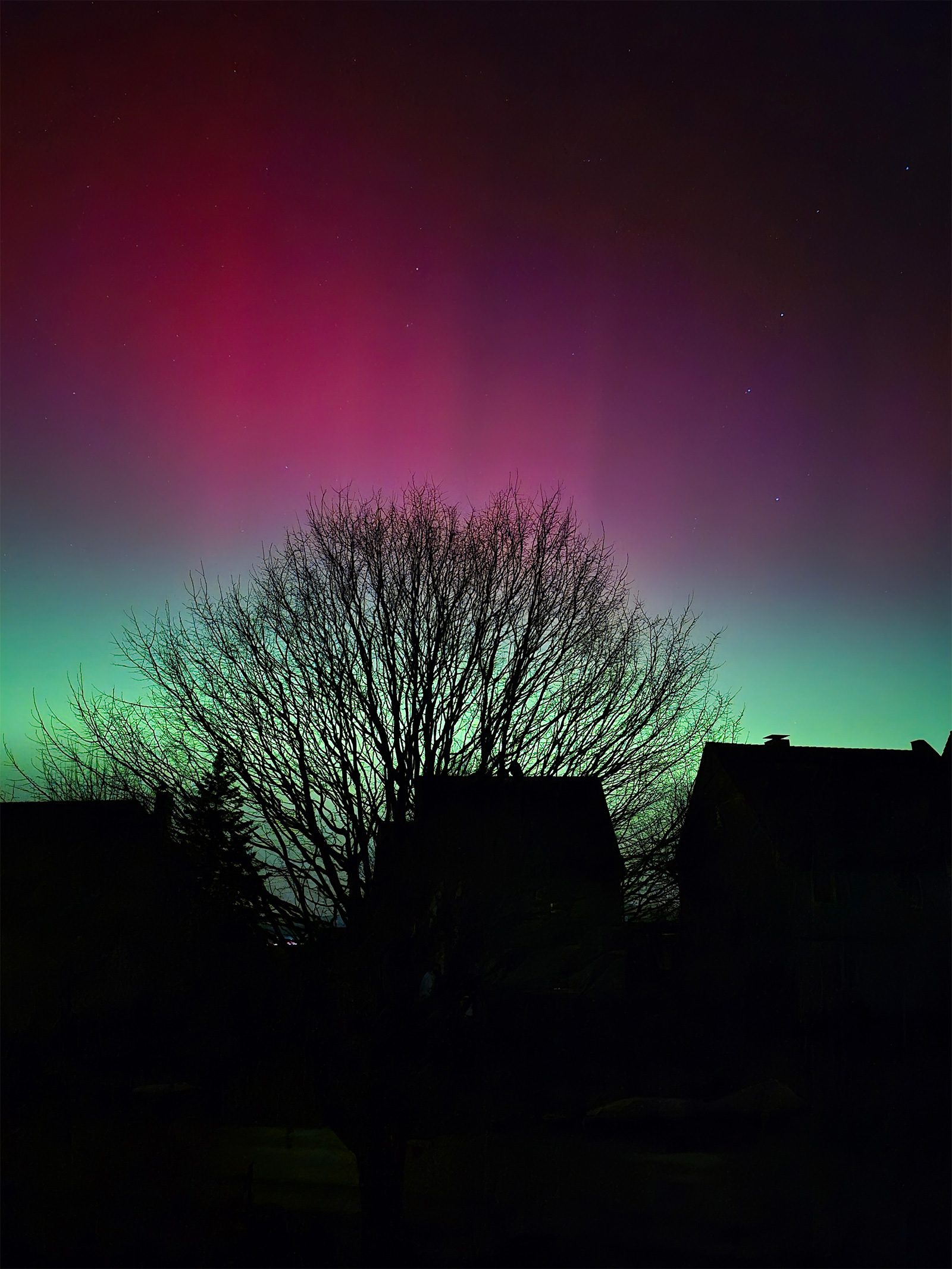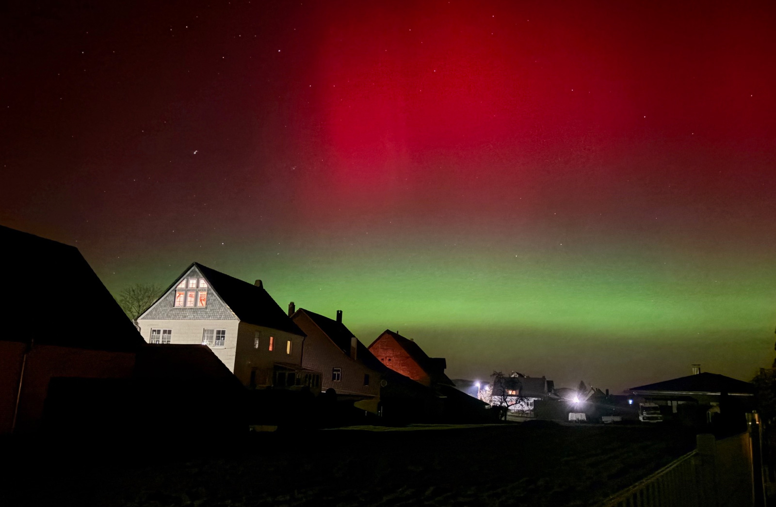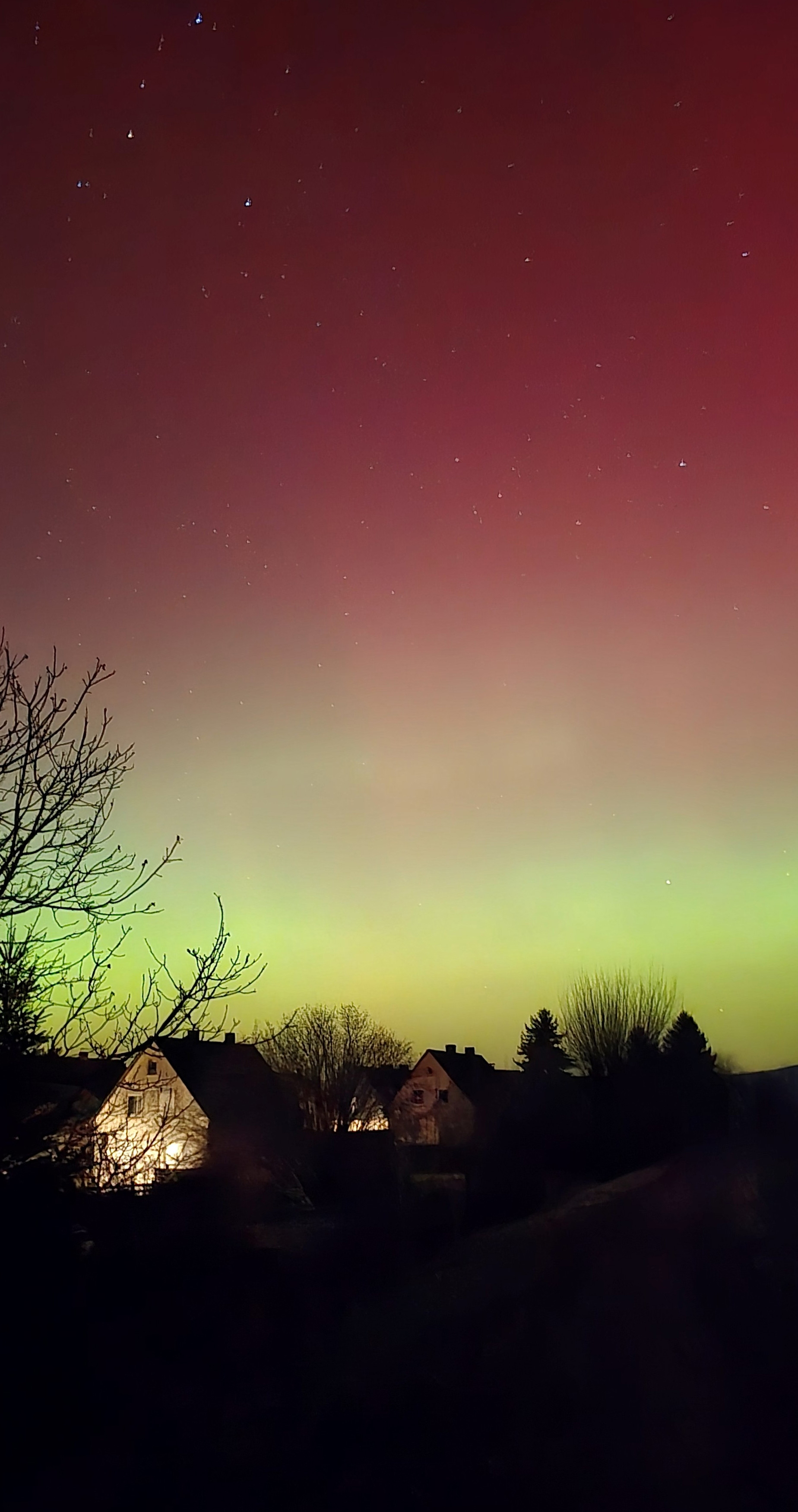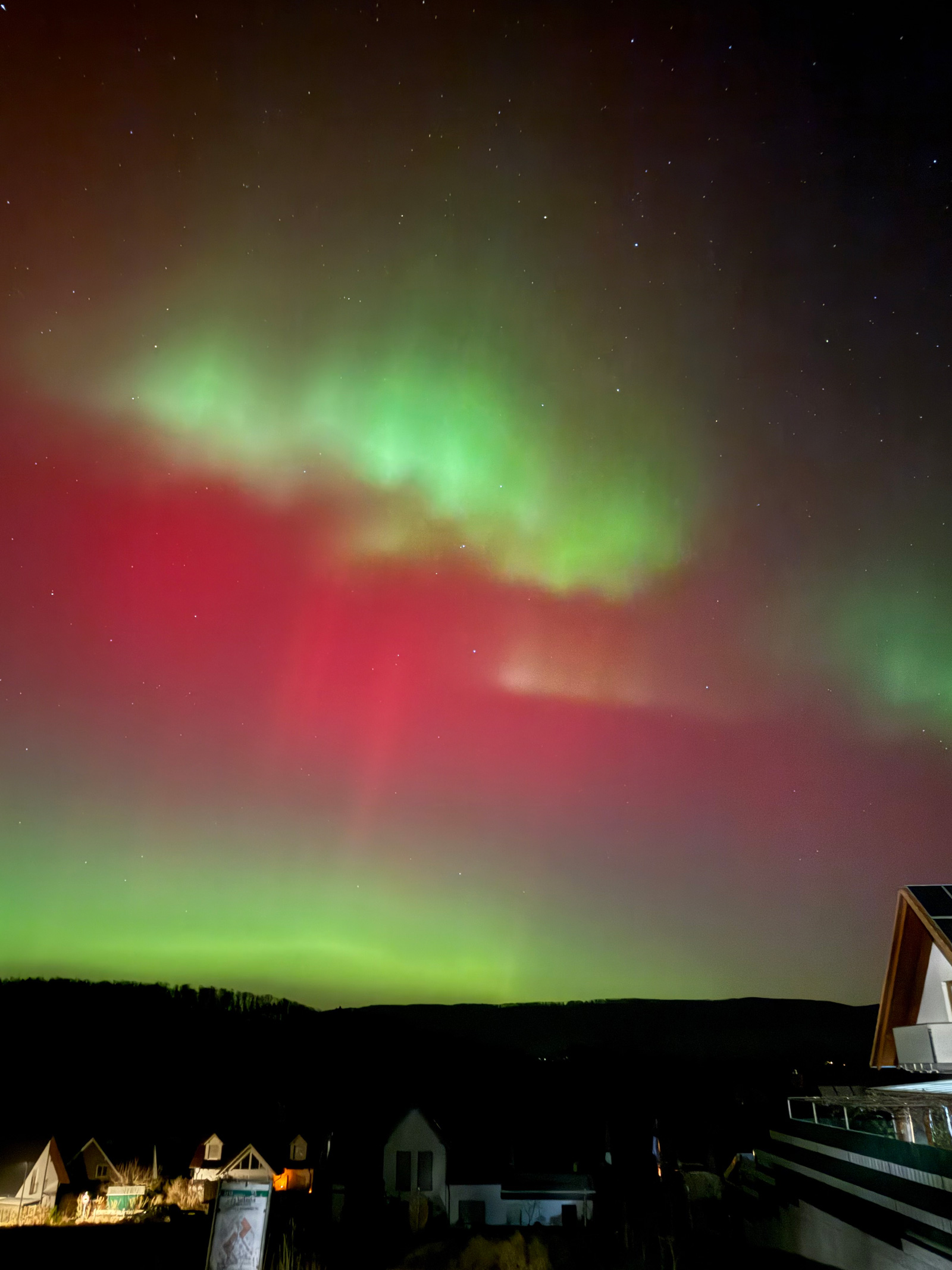 Normalerweise erscheinen Polarlichter in Mitteleuropa, wenn überhaupt, eher als blasses, weißliches Leuchten. Dass in dieser Nacht auch rötliche und grünliche Farbtöne deutlich erkennbar waren, gilt als klares Zeichen für eine besonders hohe Intensität. Sichtbare Farben mit bloßem Auge treten nur bei sehr starken geomagnetischen Ereignissen auf.