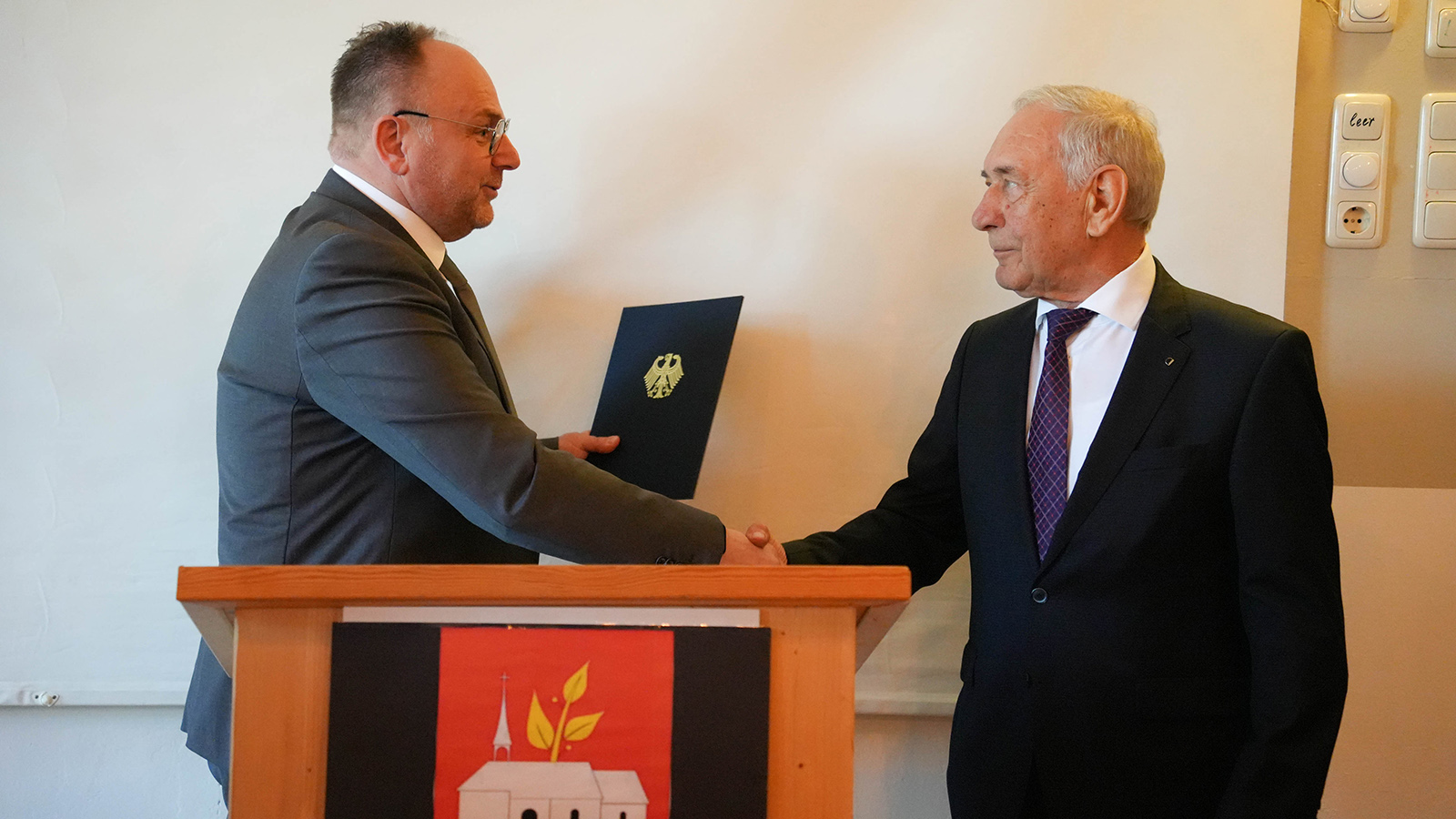 In seiner ausführlichen Laudatio fand Landrat Michael Schünemann deutliche und zugleich persönliche Worte. „Unser Staat sieht es als seine Pflicht an, all jene Bürgerinnen und Bürger, die – ohne Gegenleistung oder auf materielle Vorteile bedacht zu sein – Vorbildliches für unser Gemeinwesen leisten, besonders zu ehren und auszuzeichnen“, erklärte er zu Beginn und ordnete damit die Bedeutung der Ehrung ein.