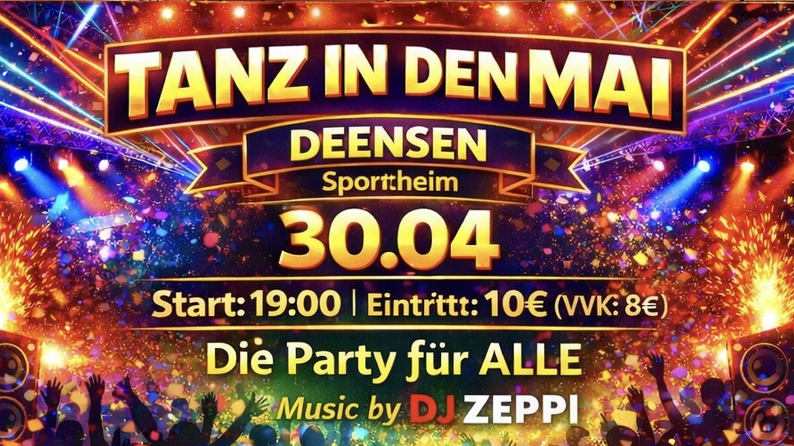 Deensen (red). Auch im Jahr 2026 lädt der VfR Deensen zum traditionellen Tanz in den Mai am 30. April ein. Gefeiert wird am Sportheim in Deensen in stimmungsvoller Atmosphäre mit Musik, Getränken und kulinarischen Angeboten.