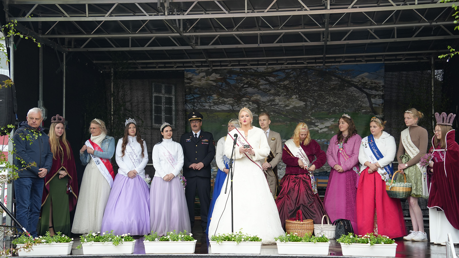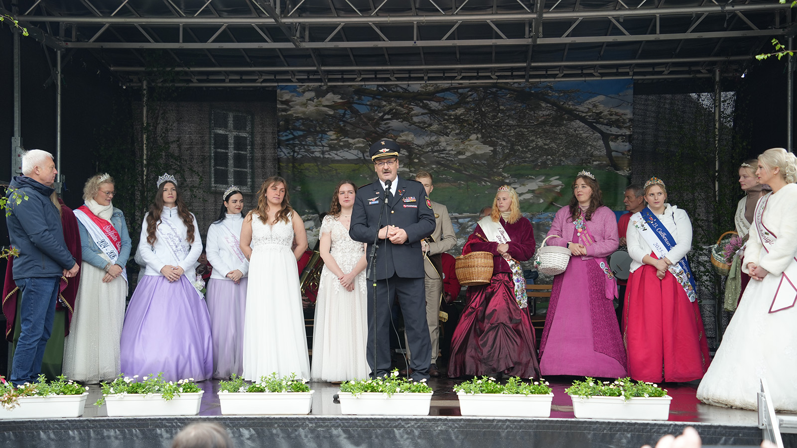Unter musikalischer Begleitung des Bläserkorps Tannengrund betrat schließlich die neue Königin die Bühne. Olaf Kapke, Präsident des Landesfeuerwehrverbandes Niedersachsen, übernahm die Krönung von Sophie I. Die 18-Jährige aus Warbsen war zuvor zwei Jahre lang Prinzessin und trägt nun den Titel der 21. Kirschblütenkönigin Golmbachs. Die neue Regentin ist Feuerwehrfrau mit Leib und Seele, zahlreiche ihrer Kollegen wohnten der Krönung bei.