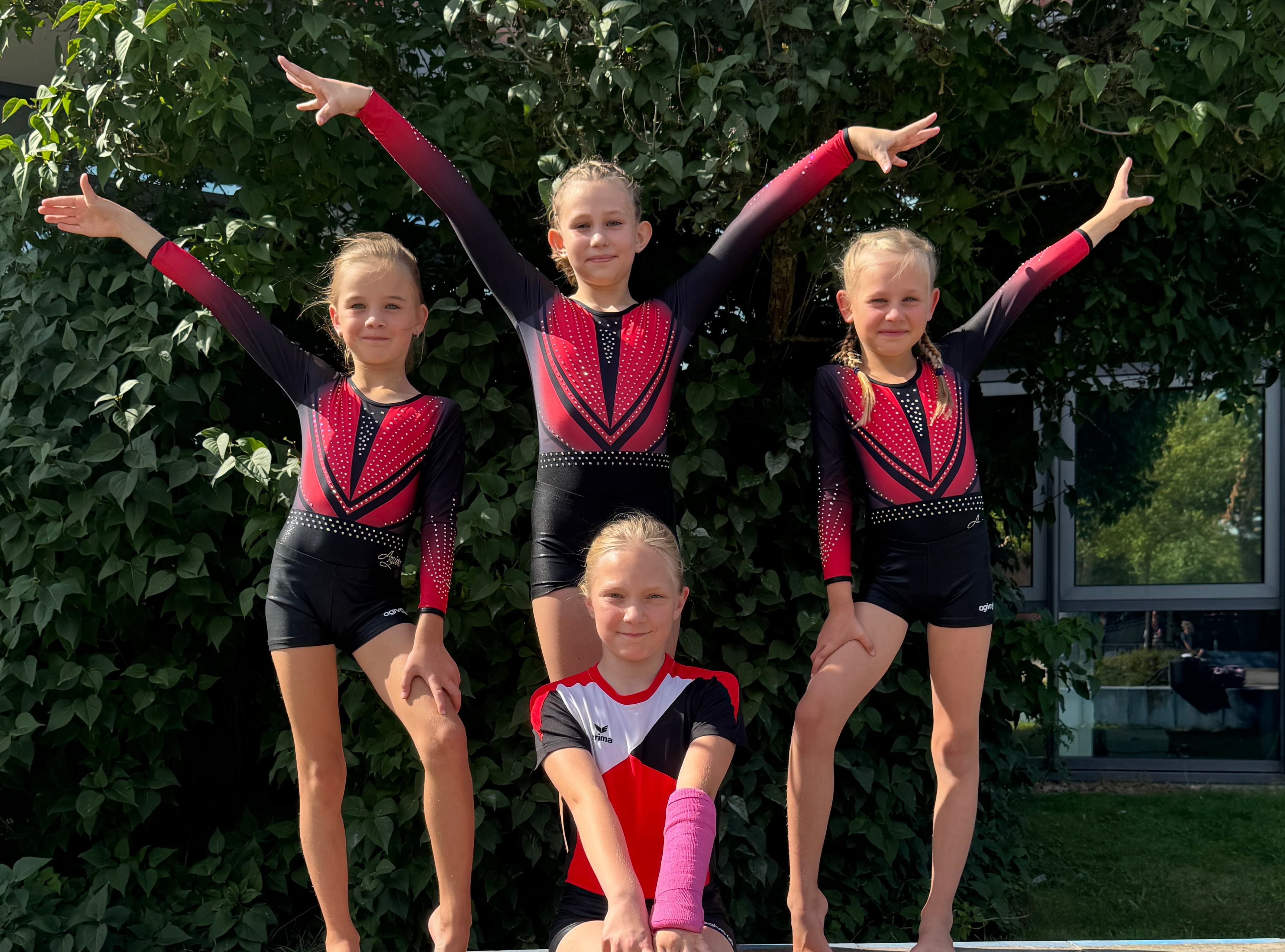 Die jüngsten Turnerinnen der Jahrgänge 2017 bis 2019 – Nia Lind, Mira Atav, Amelie Soth, Lilith Freudiger und Milena Grunow – verpassten nur hauchdünn Platz 3 in der Wettkampfstufe G2. Paradegerät war einmal mehr der Boden.
