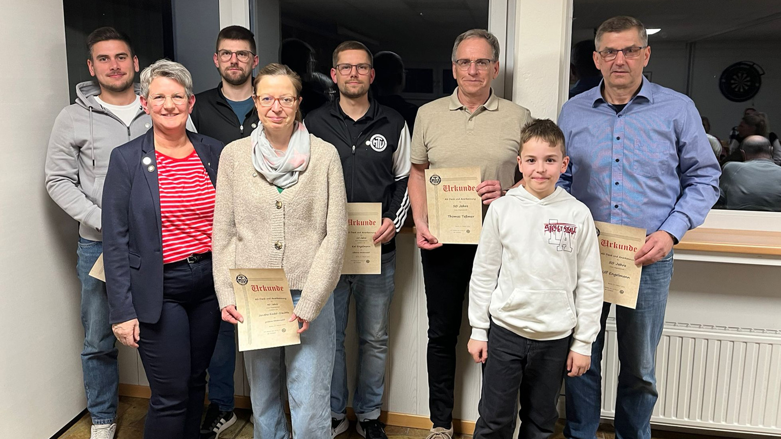 Ein Schwerpunkt des Abends lag auf den Ehrungen langjähriger Vereinsmitglieder. Zwölf Jugendliche wurden mit der Jugendehrennadel für zehnjährige Mitgliedschaft ausgezeichnet. Für 25 Jahre Vereinszugehörigkeit ehrte der Verein Marius Dörrier, Kai Engelmann, Til Engelmann, Henrike Steding und Mark Sünnemann. Seit 40 Jahren gehören Janitha Riedel-Glaubitz und Jürgen Siefart dem Verein an. Für 50 Jahre Mitgliedschaft wurden Anette Gerling, Thomas Teßmer und Ulf Engelmann ausgezeichnet.