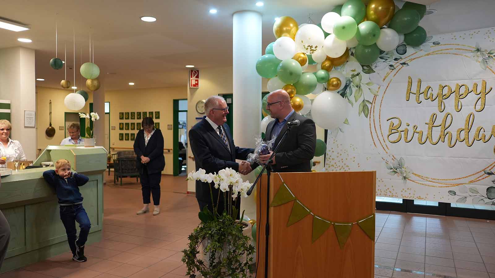 Landtagsabgeordneter Uwe Schünemann (CDU) gratulierte ebenfalls zum Jubiläum. „Auch ich sehe das Ganze als etwas, worauf man stolz sein kann, und empfinde es als eine Erfolgsgeschichte“, so Schünemann. Bewundernswert sei zudem, dass hier stets an Bewohnerinnen und Bewohner, Gäste sowie Familien gedacht werde. „Angehörige werden nie allein gelassen“, bemerkte der Landtagsabgeordnete.