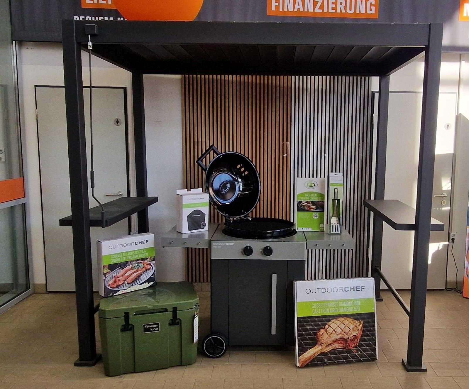 Der zweite Preis hat einen Wert von 2.500 Euro und ist als umfangreiches Grill- und Outdoor-Paket zusammengestellt. Den Rahmen bildet ebenfalls eine Pergola. Der Grillpavillon misst rund 250 x 240 x 150 Zentimeter und kombiniert Aluminium und Stahl in Anthrazit. Laut Produktbeschreibung verfügt er über ein Lamellendach mit verstellbaren Öffnungswinkeln, das vor Sonne, Wind und Regen schützen soll. Zwei seitliche Ablagen bieten zusätzlichen Platz für Grillutensilien, Getränke oder Zutaten.