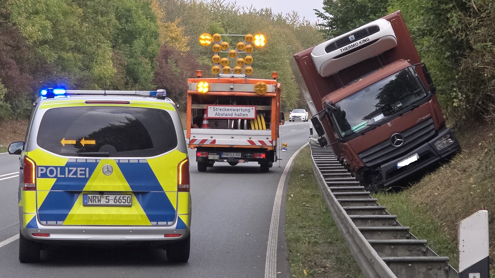 Der Lkw kam zwar abseits der Fahrbahn zum Stehen, eine Gefahr für den laufenden Verkehr bestand zunächst jedoch nicht. Aktuell wird die Bergung vorbereitet. Da der Lastwagen nicht ohne schweres Gerät hinter der Leitplanke hervorgeholt werden kann, soll ein Kranfahrzeug zum Einsatz kommen. Für die Arbeiten muss die B64/83 zeitweise voll gesperrt werden. Die Polizei bittet alle Verkehrsteilnehmer darum, den Bereich großräumig zu umfahren.