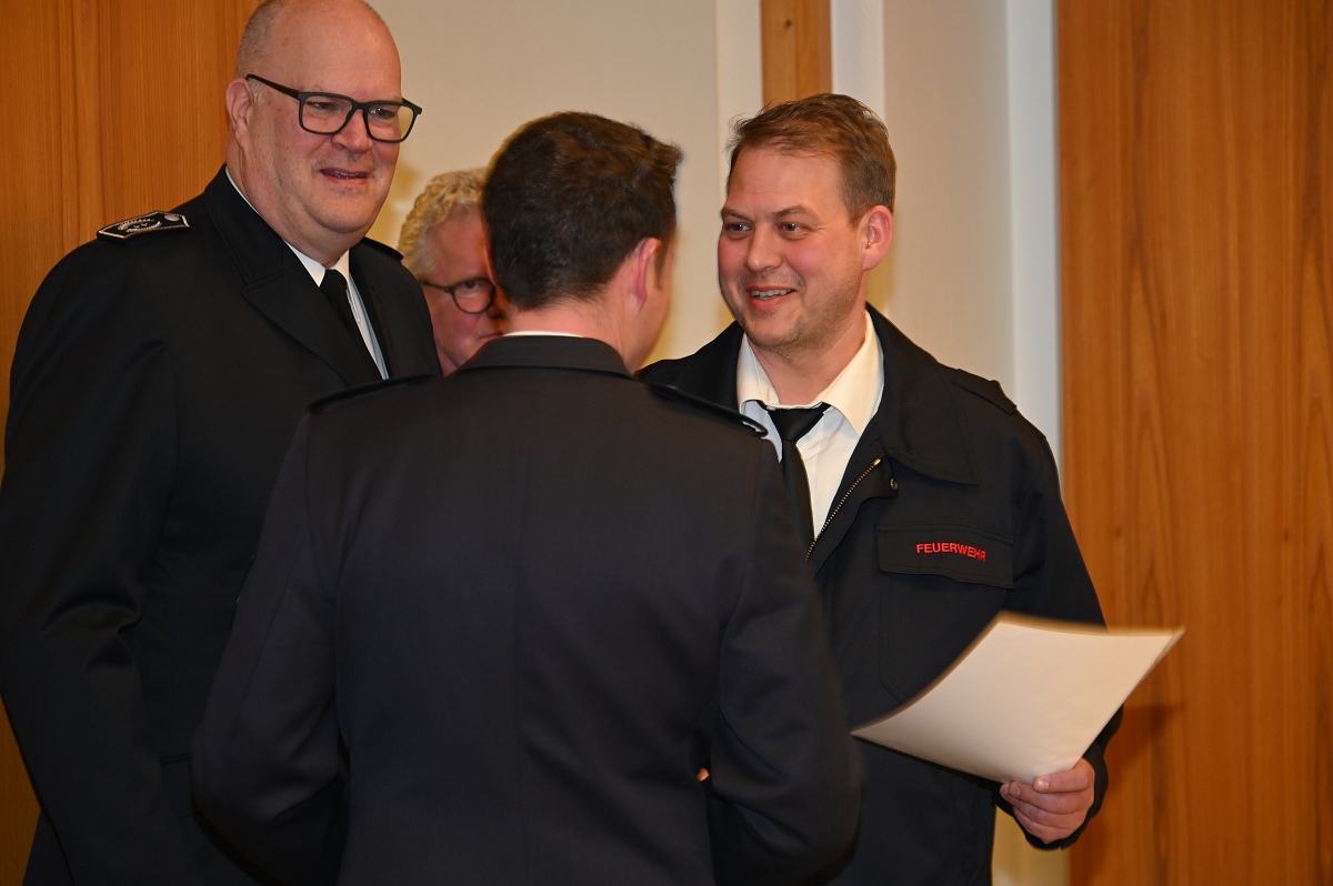 Im Anschluss folgten zahlreiche Ehrungen. Das Feuerwehrehrenzeichen des Landes Nordrhein-Westfalen in Gold verlieh Bürgermeister Daniel Hartmann an Hauptfeuerwehrmann Rolf Hillebrecht, Hauptbrandmeister Andreas Klie, Hauptfeuerwehrmann Jens Lippelt sowie Unterbrandmeister Oliver Heine. Das Ehrenzeichen in Silber für 25 Jahre aktiven Feuerwehrdienst erhielt Unterbrandmeister Sebastian Heine.
