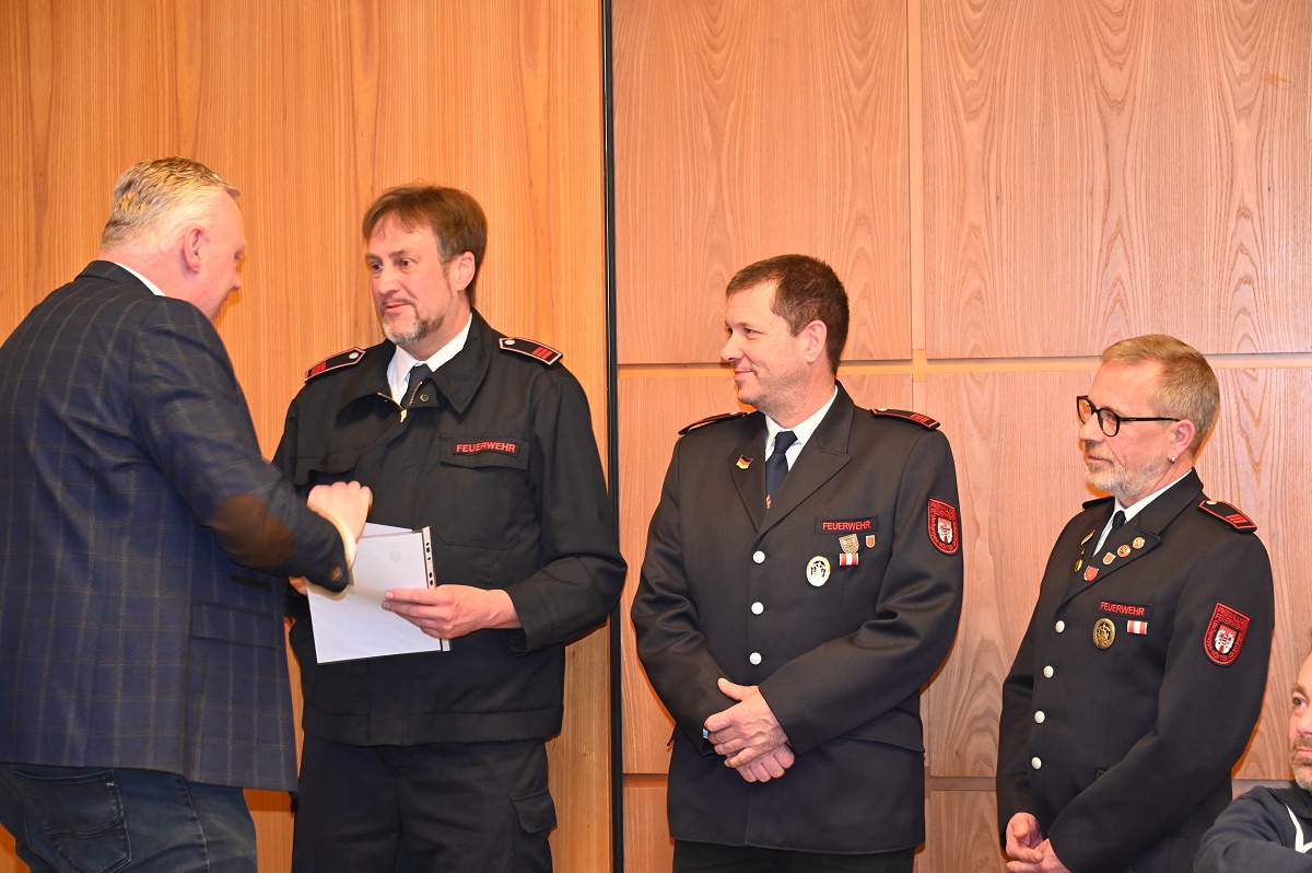 Für zehn Jahre aktiven Dienst wurden Unterbrandmeister Timo Heine und Fabian Rosner in Abwesenheit sowie Hauptfeuerwehrmann Julian Jöhren und Unterbrandmeister Maximilien Meise ausgezeichnet. Urkunden für 20 Jahre aktive Mitgliedschaft erhielten Rudolf Lützer, Patrick Haller und Lukas Heine.