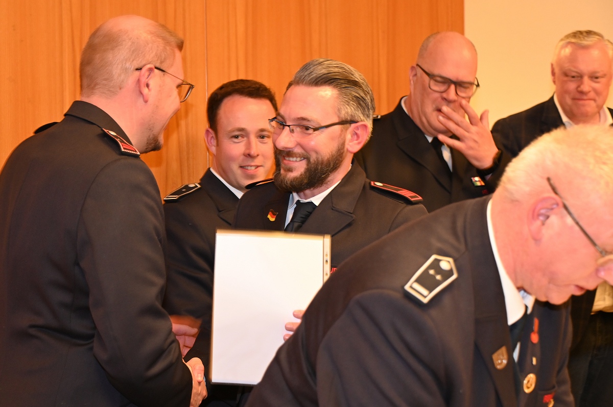 Auch Beförderungen standen auf der Tagesordnung. Zu Unterbrandmeistern wurden Anna Lena Becher, Benjamin Leiße und Noah Hesse befördert. Zum Oberfeuerwehrmann wurden Frederik Hamelmann und Carsten Olandt ernannt. Ingo Wittkowski und Leon Wresche erhielten die Ernennung zum Feuerwehrmann. Für die 30. erfolgreiche Teilnahme an Leistungswettkämpfen wurde Wolfgang Oppermann mit dem Leistungsabzeichen in Gold mit der Zahl 30 ausgezeichnet. Das silberne Leistungsabzeichen erhielt Anna Lena Becher.