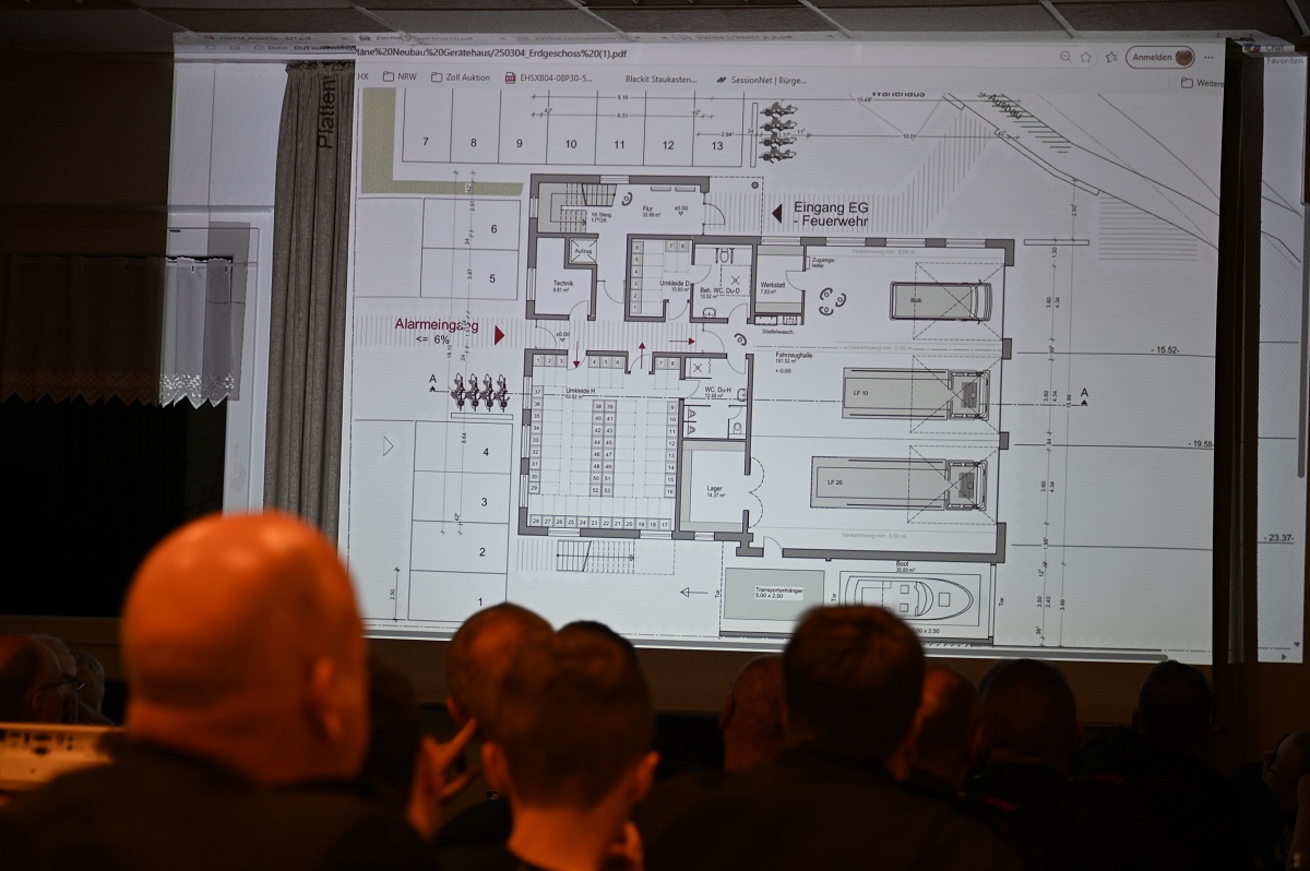 Ausführlich informierten die Verantwortlichen über den aktuellen Stand des Neubaus des Feuerwehrgerätehauses. Aufgrund der kalten Witterung sind die Bauarbeiten derzeit eingeschränkt. Während die Fundamente bereits gegossen wurden, konnte die Bodenplatte bislang noch nicht hergestellt werden. Erstmals wurden den Mitgliedern die Baupläne per Beamer vorgestellt. Vorgesehen sind vier Fahrzeughallen für drei Einsatzfahrzeuge sowie ein Feuerwehrboot. Das Gebäude wird nach modernen Standards errichtet und erhält einen Aufzug. Damit entsteht das erste Feuerwehrgerätehaus im Stadtgebiet Höxter mit einem eigenen Aufzug. Das bisherige Gerätehaus sowie das rund 120 Jahre alte ehemalige Schulgebäude wurden bereits abgerissen.