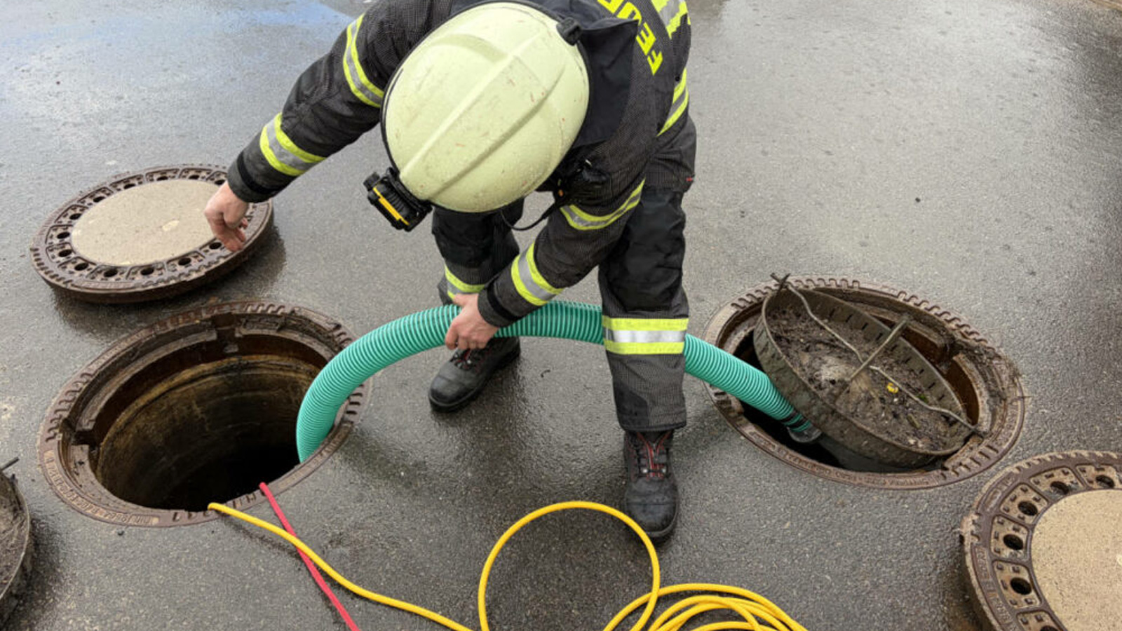 Mit Pumpen und einem Nasssauger befreite die Feuerwehr Eschershausen den Keller Schritt für Schritt vom eingedrungenen Wasser. In enger Abstimmung mit dem zuständigen Wasserverband wurde anschließend auch der betroffene Abwasserkanal leergepumpt, um den Rückstau vollständig zu beseitigen.