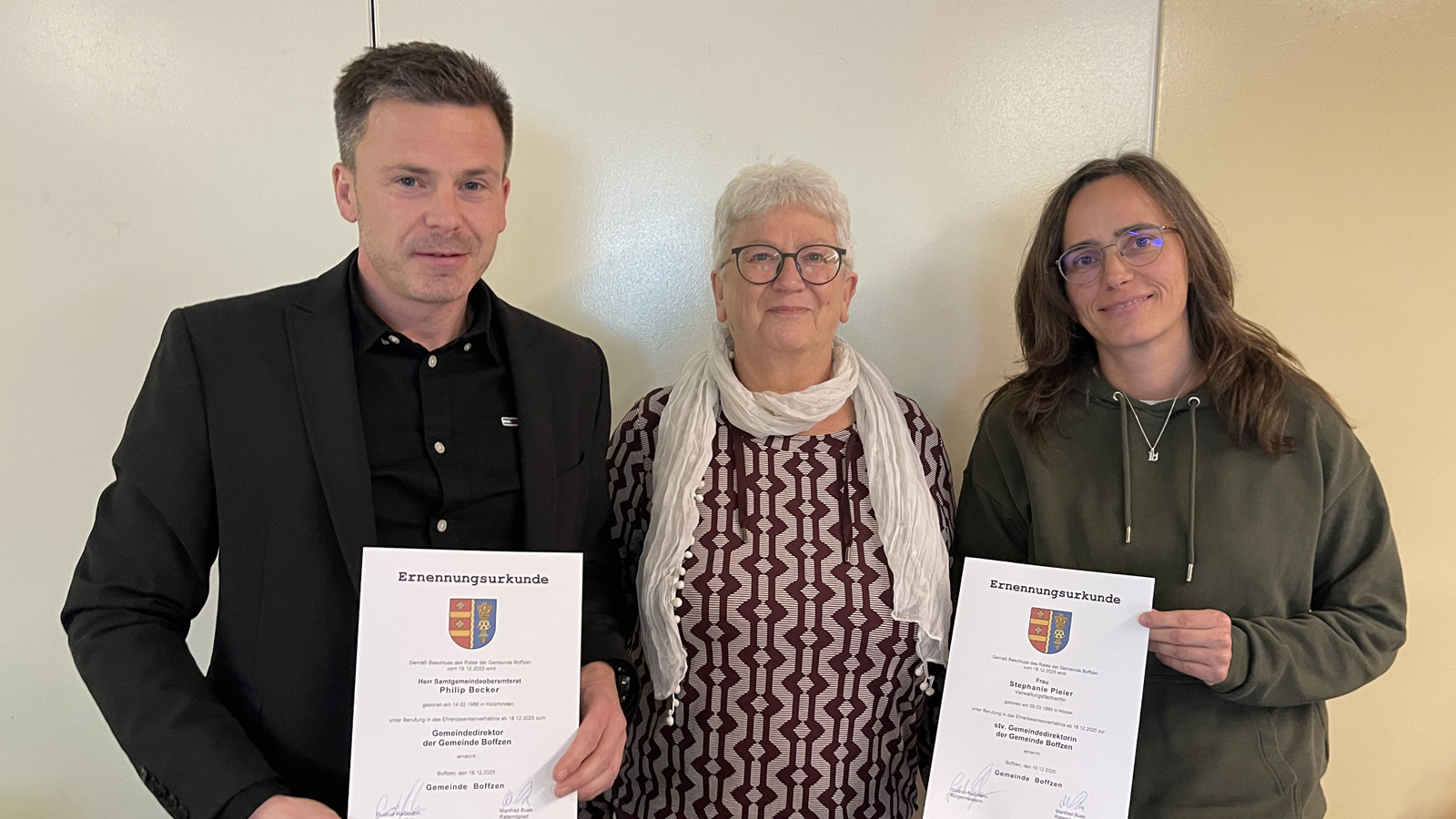 Die Ernennungsurkunden für beide Personalentscheidungen wurden im Rahmen der Ratssitzung von Bürgermeisterin Gudrun Raßmann im Namen des Rates überreicht. Mit den einstimmigen Beschlüssen setzt der Rat der Gemeinde Boffzen bewusst auf Kontinuität, Verwaltungserfahrung und eine verlässliche personelle Aufstellung an der Spitze der Gemeindeverwaltung.