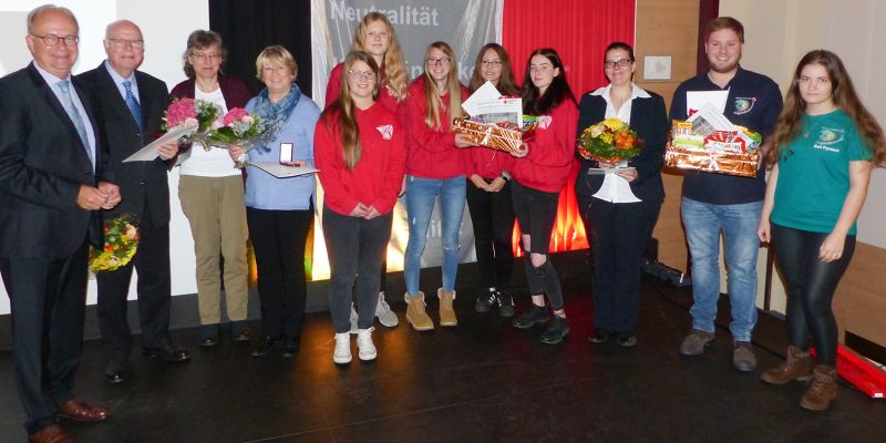 Die Verdienstmedaille des DRK-Landesverbandes für besondere Leistungen erhielten Angela Kreusel, Vorsitzende des DRK-Ortsvereins Hachmühlen, Hildegard Müller, Vorsitzende des DRK-Ortsvereins Fischbeck, Annika Prothmann, JRK-Leiterin sowie Manfred Reichert, Vizepräsident. Die Ehrenmitgliedschaft erhielten ab dem 1.1.2018 Maria Bursee, Sigrid Eckermann, Elke Quast-Schmidt und Ruth Walten. Für die Leistungen bei den Kreis-, Landes- und Bundeswettbewerben wurden die JRK-Gruppen der Stufe III aus Bad Pyrmont sowie die Gruppe der Stufe II aus Amelgatzen gewürdigt.