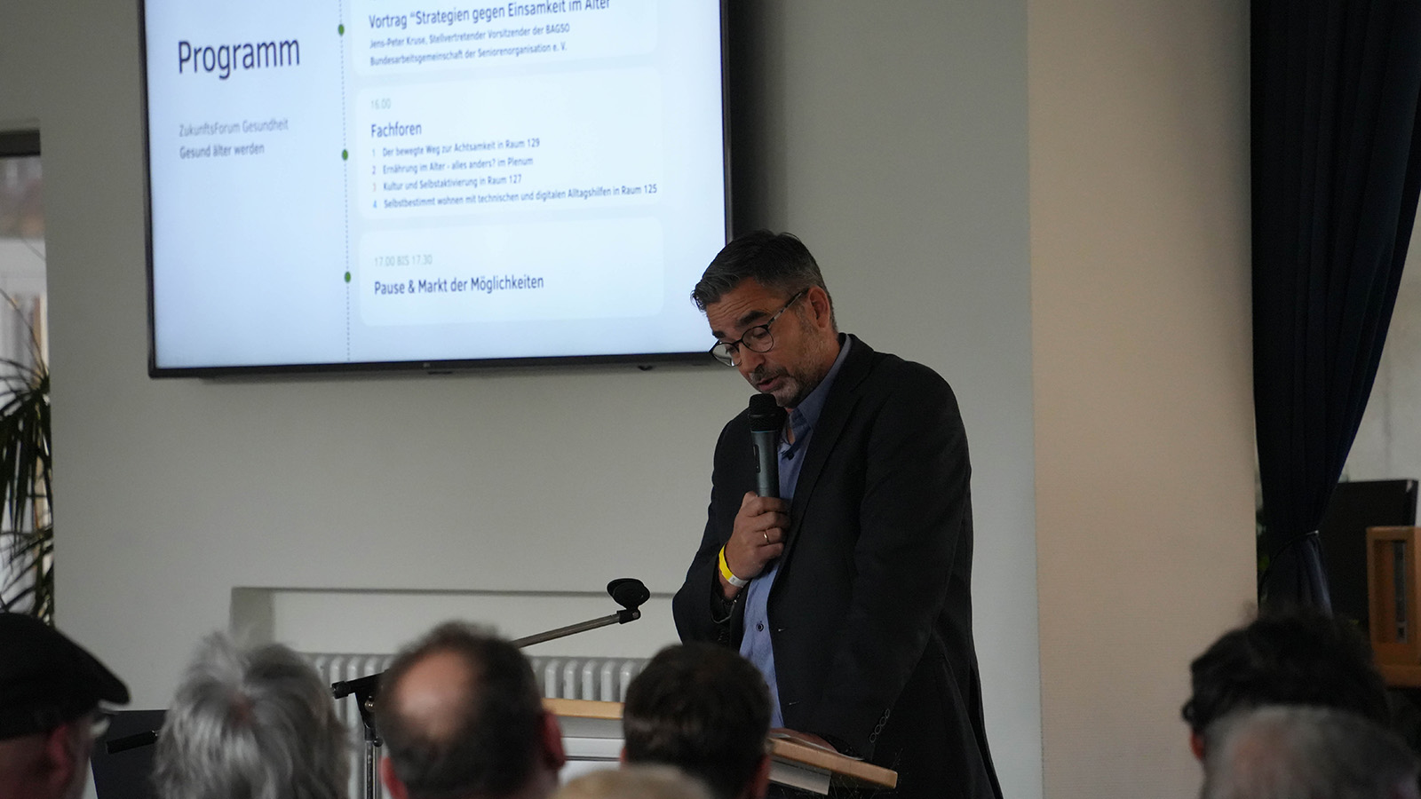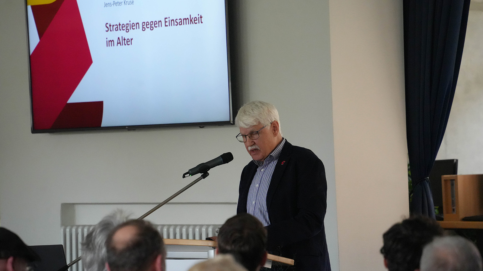 Die Rede Arbogasts wird durch Jens-Peter Kruse, stellvertretender Vorsitzender der Bundesarbeitsgemeinschaft der Seniorenorganisation e.V., mit einem Vortrag zum Thema Einsamkeit abgelöst. Hierbei stellt er die Formen von Einsamkeit dar, wie diese entstehen und welche Zusammenhänge es gibt sowie Maßnahmen der Kommunen, um der Einsamkeit entgegenwirken zu können. Spannend hierbei waren Zahlen und Studien, die zum Beispiel darlegten, dass Menschen im jungen Alter oft einsamer seien als Ältere. Außerdem entstünde aus der Einsamkeit heraus rechtsextremistische Gedanken sowie physische als auch psychische Probleme.