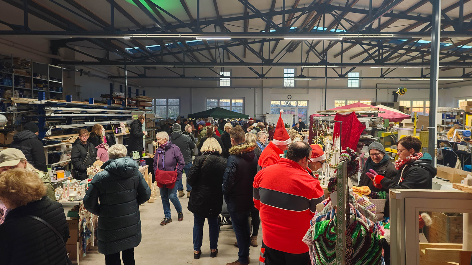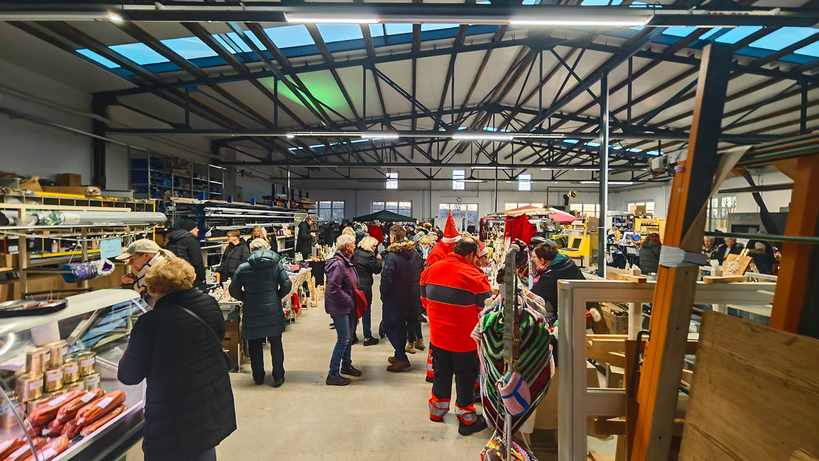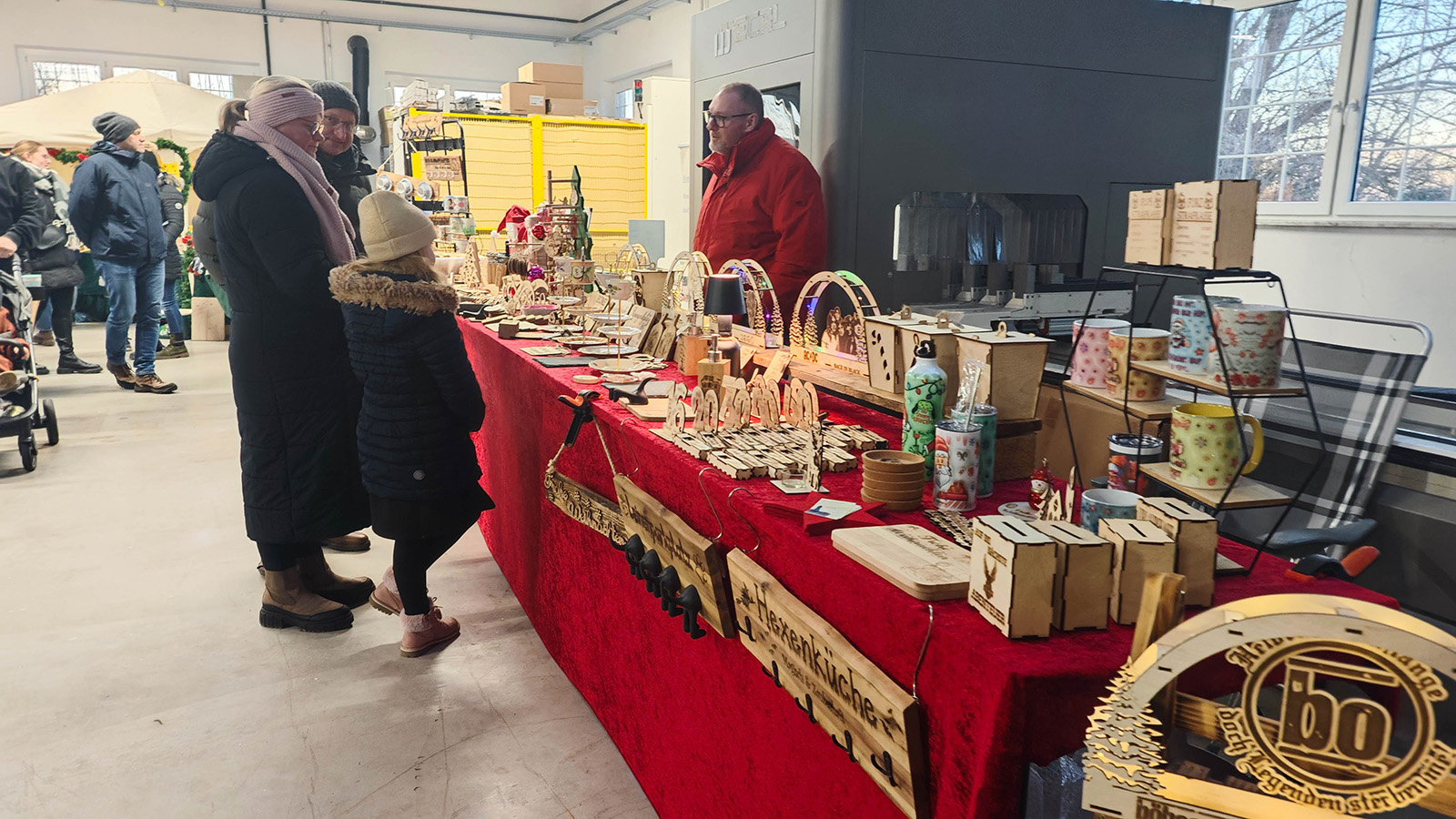 Schon beim Betreten des Geländes kam festliche Stimmung auf: hell leuchtende Girlanden, mit Tannen und Schleifen geschmückte Zäune, der Duft von Glühwein und anderen Köstlichkeiten sowie der ausgelegte Rindenmulch sorgten für eine authentische Weihnachtsatmosphäre. In der Halle der Holzhandlung erwartete die Gäste ein bunter Weihnachtsmarkt mit einer Vielfalt an handgefertigten Dekorationen, Holzarbeiten, Schmuck und regionalen Produkten – ideal, um das ein oder andere Weihnachtsgeschenk zu entdecken.