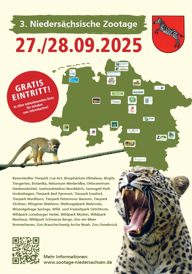 Neuhaus (red). Am 27. und 28. September finden bereits zum dritten Mal die Niedersächsischen Zootage statt. Dann erkennen die zoologischen Einrichtungen in Niedersachsen und Bremen die Jahreskarten der jeweils anderen teilnehmenden Zoos an. Jahreskarteninhaber erhalten so an beiden Tagen freien Eintritt in insgesamt 24 Zoos, Tier- und Wildparks.