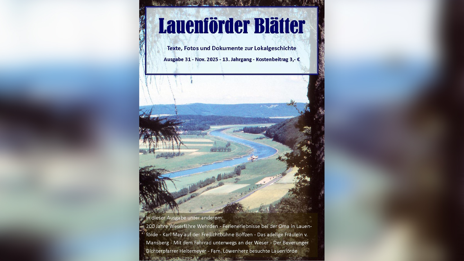 Lauenförde (red). Der Heimat- und Geschichtsverein Lauenförde e. V. hat die 31. Ausgabe der Lauenförder Blätter – Texte, Fotos und Dokumente zur Lokalgeschichte herausgegeben. Das Heft umfasst 48 Seiten im handlichen DIN-A5-Format und bietet eine vielseitige Sammlung historischer Beiträge und Fotografien aus der Region.