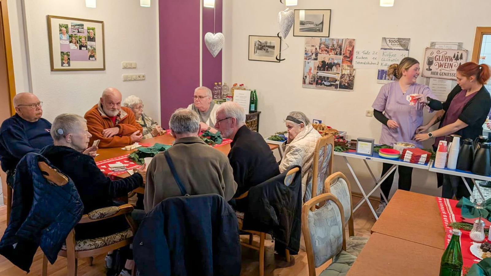 Die Besucherinnen und Besucher genossen den Nachmittag in gemütlicher Atmosphäre. Bei warmen Getränken, frisch gebackenem Kuchen und herzhaften Speisen bot sich reichlich Gelegenheit für Gespräche und Begegnungen. Die Bewohnerinnen und Bewohner der Senioren-WG hatten im Vorfeld mit viel Freude an der Herstellung der weihnachtlichen Dekoration mitgewirkt.