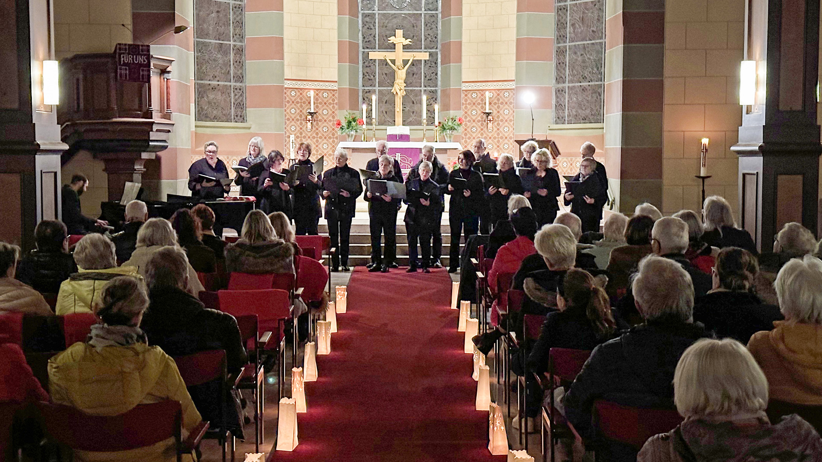 Ein weiteres Highlight des Abends war das gemeinsame Singen der Weihnachtslieder „Freunde, dass der Mandelzweig“, „Seht, die gute Zeit ist nah“ und „Tochter Zion“, bei dem Chor und Publikum zu einer festlich-feierlichen Einheit wurden. Die zahlreichen Kerzen, die die Kirche in warmes Licht tauchten, verstärkten die weihnachtliche Atmosphäre zusätzlich.