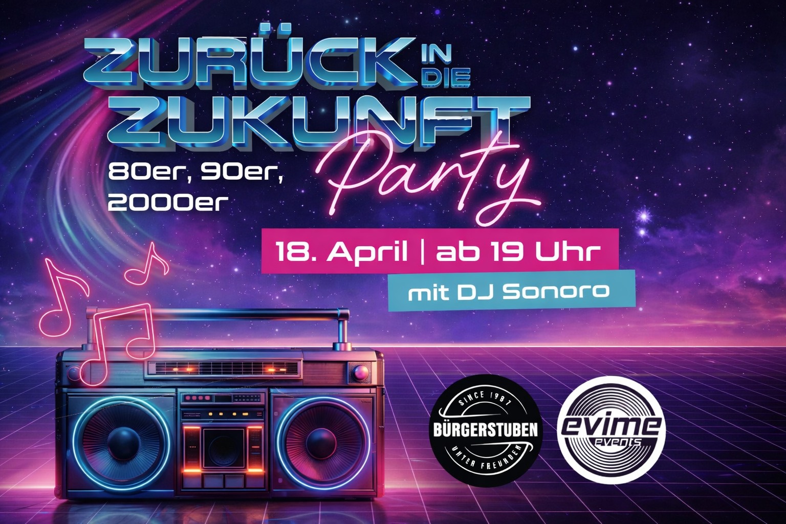 Höxter (zir). Mit der Party „Zurück in die Zukunft – Die 80er, 90er & 2000er Party!“ steht am 18. April 2026 in den Bürgerstuben Höxter eine musikalische Zeitreise durch drei Jahrzehnte bevor. Ab 19 Uhr soll die Veranstaltung an der Adresse „Am Markt“ in Höxter beginnen.