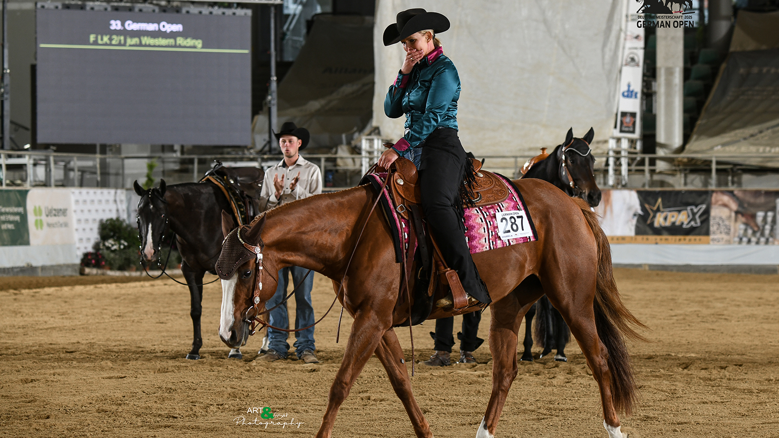 Doch als ein weiterer Konkurrent ausscheidet und Schünemann gemeinsam mit Anika Grönemeyer zu zweit auf dem Platz steht, ändert sich ihre Einschätzung nicht. „Anika war deutlich besser als ich“, pocht es in ihrem Kopf. Der Griff um die Zügel wird fester, die Füße wippen in den Steigbügeln und dann ertönt die Stimme des Richters: Der zweite Platz geht an Anika Grönemeyer – und der erste somit an Stefanie Schünemann. Ein fassungsloser Blick geht zum Ehemann, dann zu ihren Schülerinnen: „Die müssen einen Fehler gemacht haben.“ Tränen steigen auf, ein Lächeln breitet sich aus – die Gefühlswelt explodiert. Ungläubig nimmt sie das Buckle (eine Gürtelschnalle) entgegen. Sie und ihr Pferd „Hermine“ sind Deutsche Meister im Western Riding Junior.