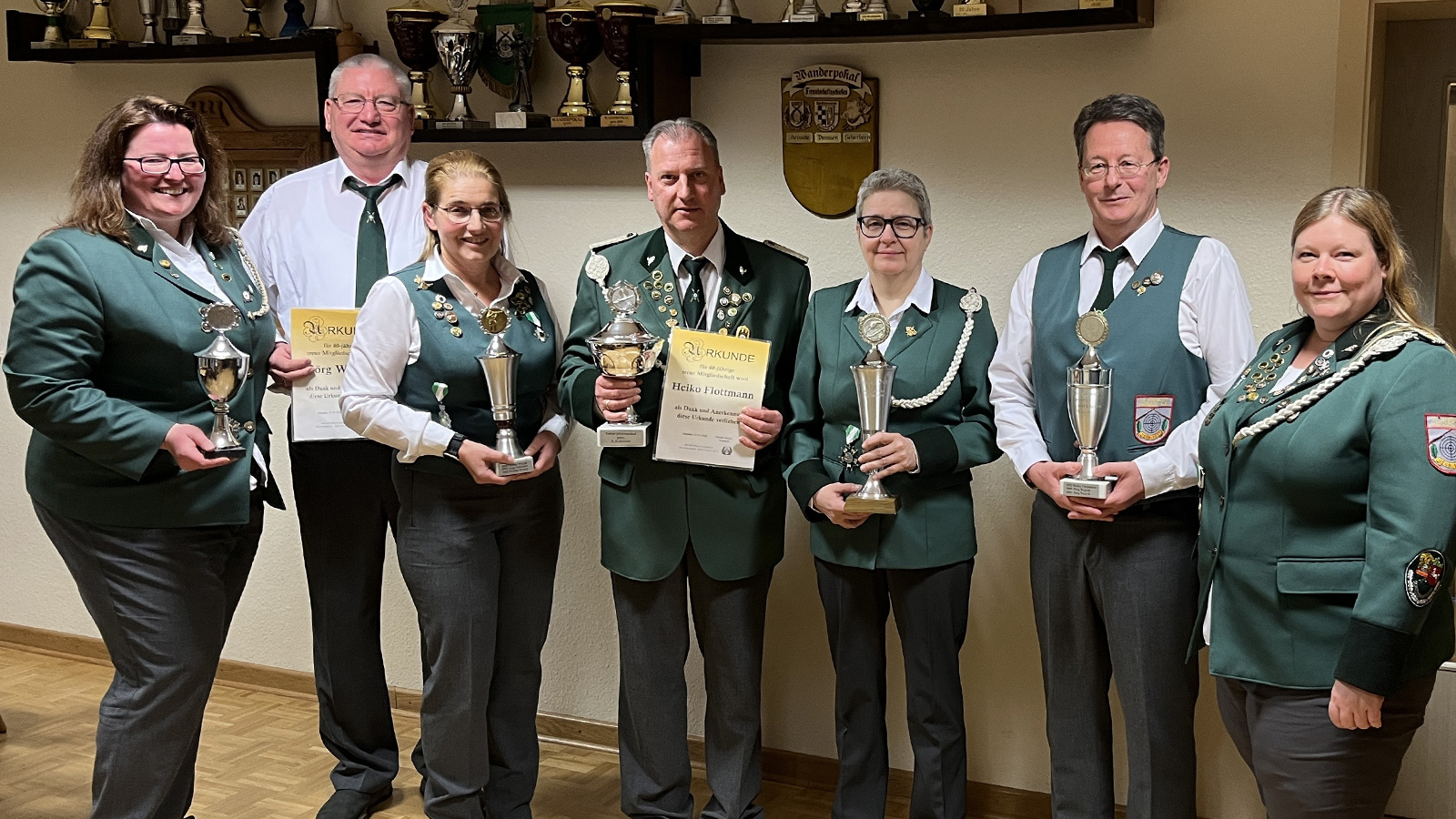 Ein besonderer Moment der Versammlung waren die Ehrungen. Für beeindruckende 40 Jahre Mitgliedschaft wurden Heiko Flottmann und Jörg Wojcik ausgezeichnet. Auch die erfolgreichen Schützinnen und Schützen des vergangenen Jahres wurden geehrt: Jahresmeister in der Disziplin Luftgewehr Auflage wurde Olaf Schröder, im Luftgewehr Freihand Sabrina Wojcik, im Kleinkaliber Freihand Anja Schröder. Der Kleinkaliber-Auflage-Wettbewerb (KK-Teiler-Pokal) ging an Heiko Flottmann. Den Silvesterpokal mit der besten Zehn sicherte sich Melanie Fricke.