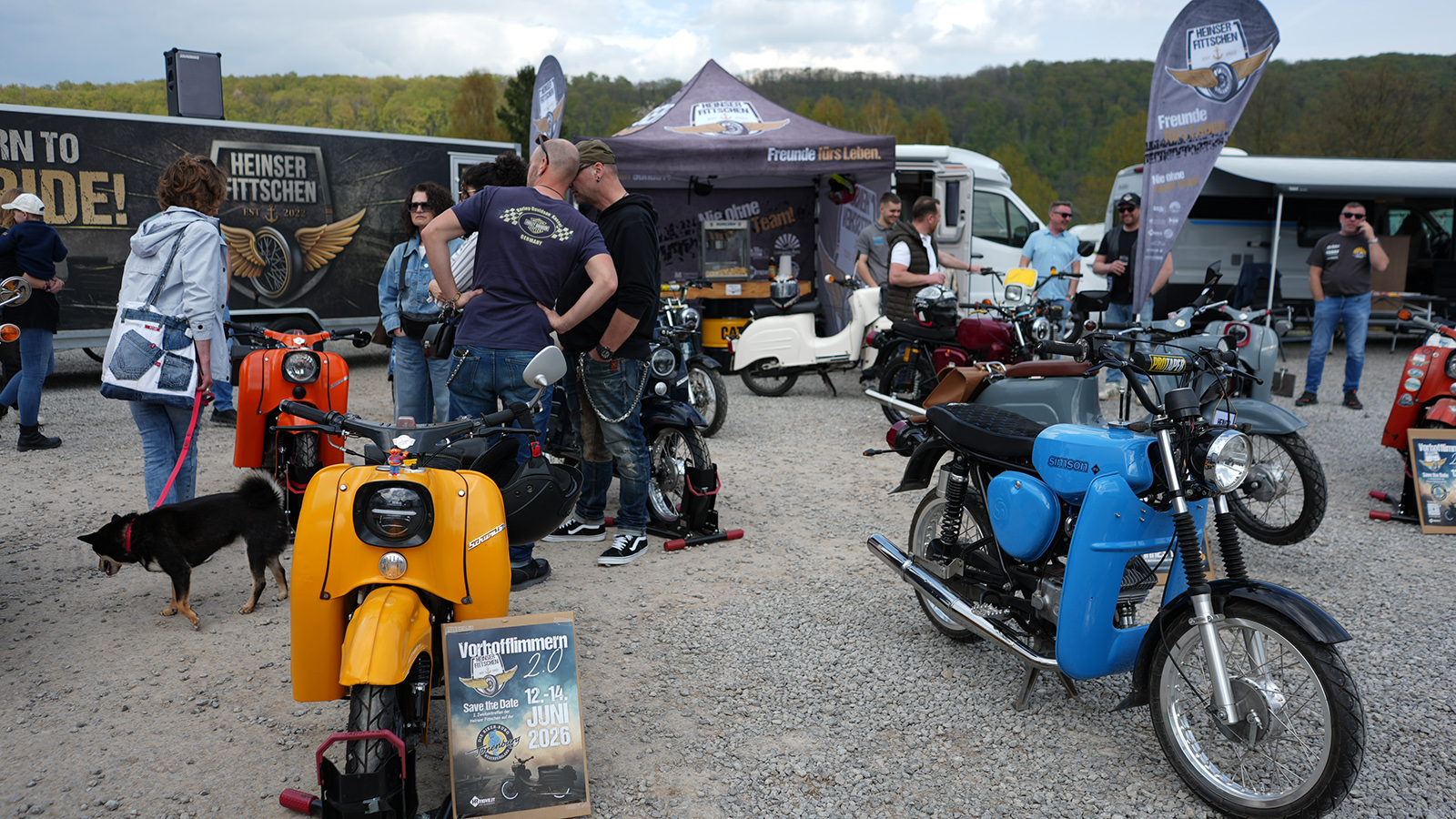 Für zusätzliche Abwechslung sorgten weitere Ausstellungsstücke und Angebote: Dazu zählten eine Quadausstellung, ein Porsche 928 S aus den 70er Jahren sowie ein auffällig folierter Mercedes AMG. Heinser Fittschen war mit einem Großaufgebot an Zweitaktern vor Ort und machte sowohl auf das Vorhofflimmern als auch auf die Barcelona-Reise vor zwei Jahren aufmerksam.